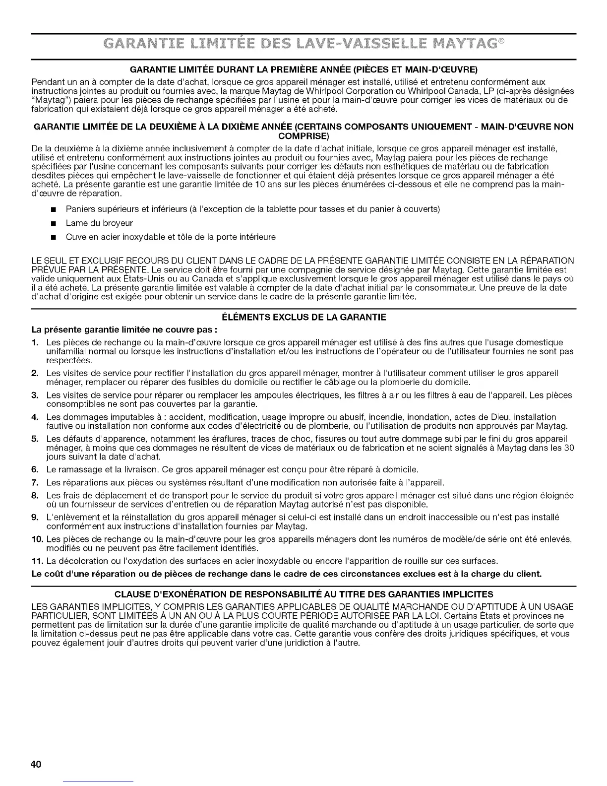 instructions jointes au produit ou fournies avec, la marque Maytag de Whirlpool Corporation ou Whirlpool Canada, LP (ci-apr_s designees
