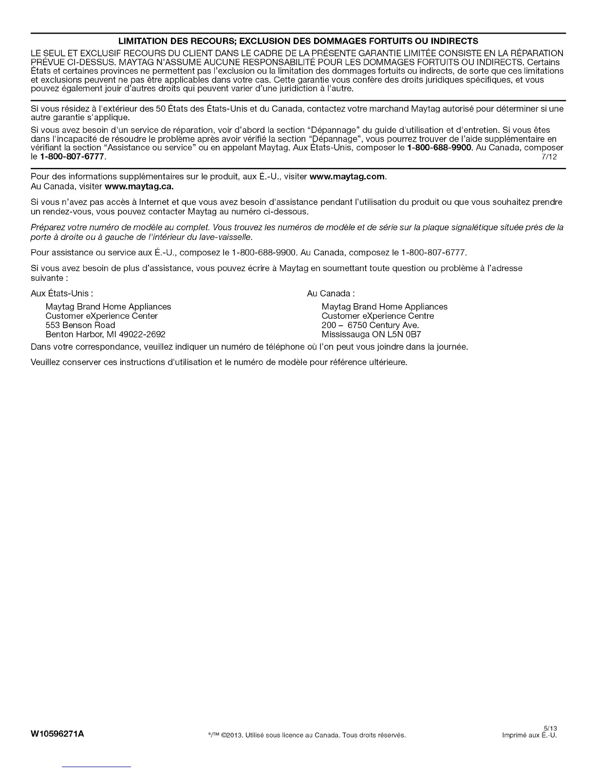 PRI2VUE CI-DESSUS. MAYTAG N'ASSUME AUCUNE RESPONSABILITI 2 POUR LES DOMMAGES FORTUITS OU INDIRECTS. Certains