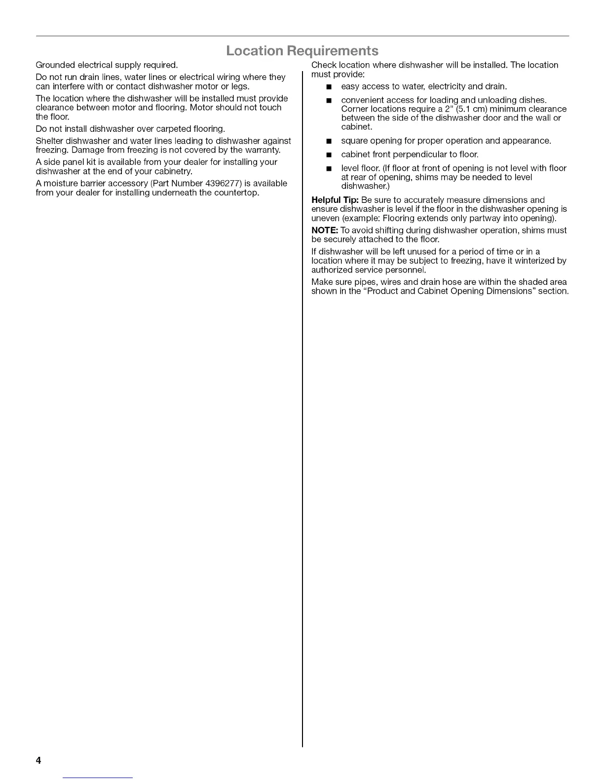 The location where the dishwasher will be installed must provide