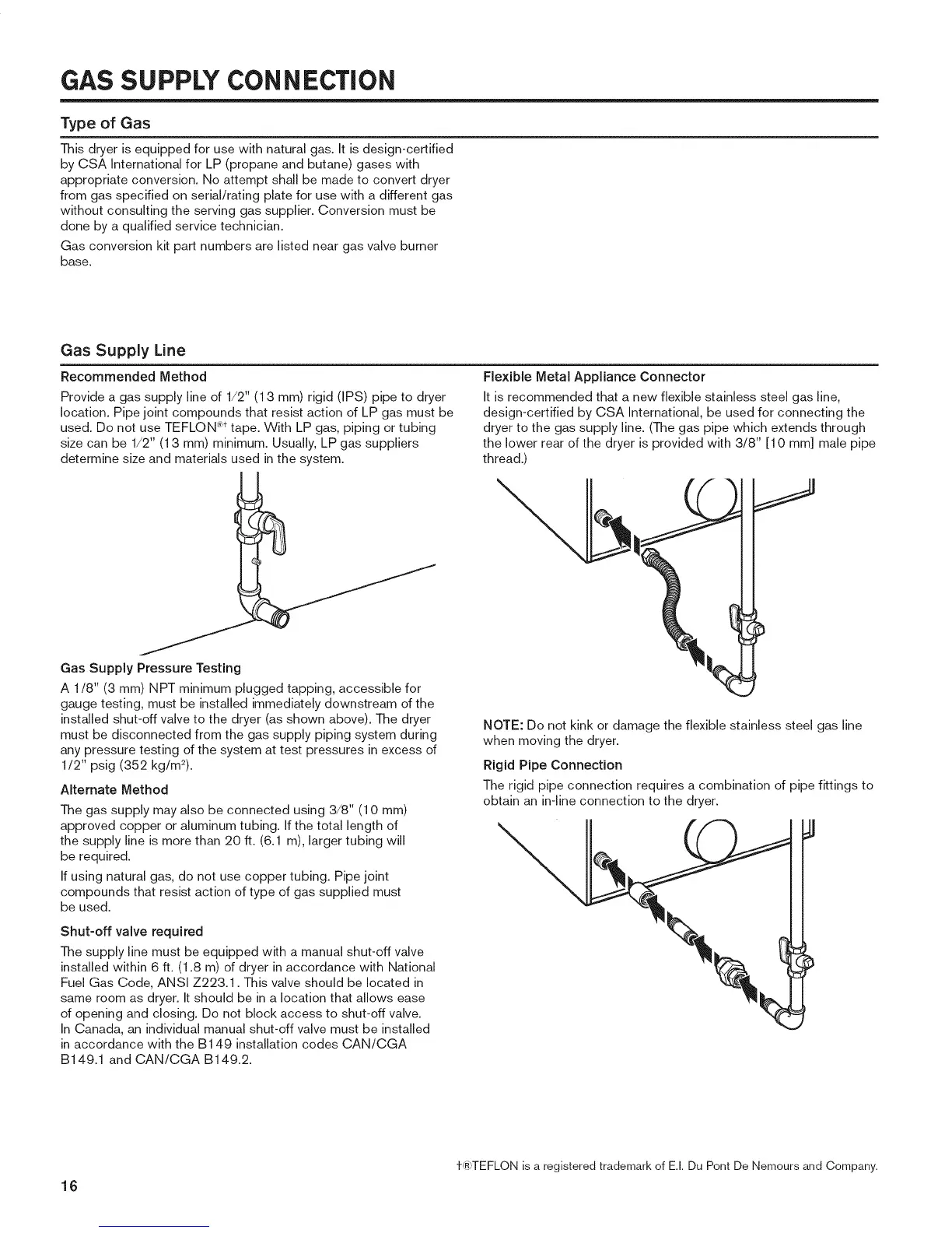 Provide a gas supply line of 1/2" (13 ram) rigid (IPS) pipe to dryer