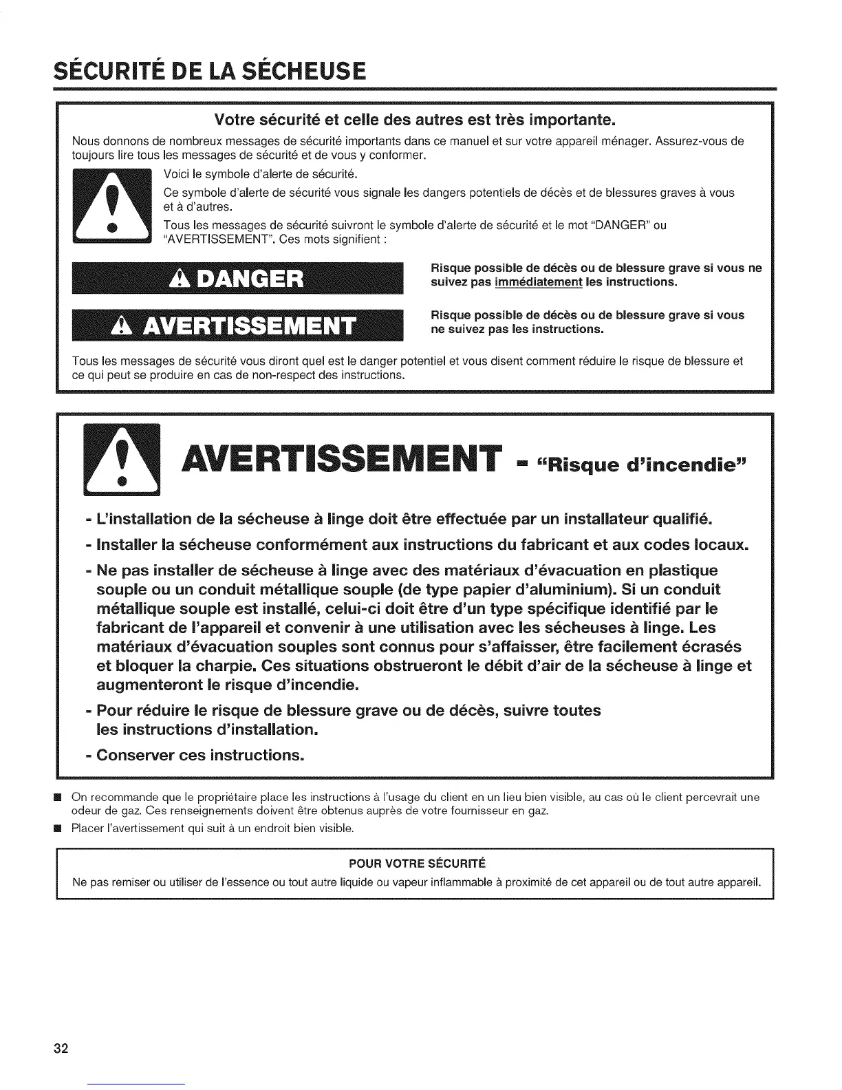 Ne pas remiser ou utiliser de I'essence ou tout autre liquide ou vapeur inflammable & proximit6 de cet appareil ou de tout autre appareil.