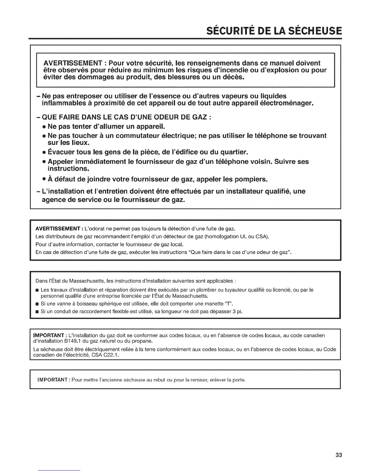 Dans I'Etat du Massachusetts, les instructions d'installation suivantes sont applicables :