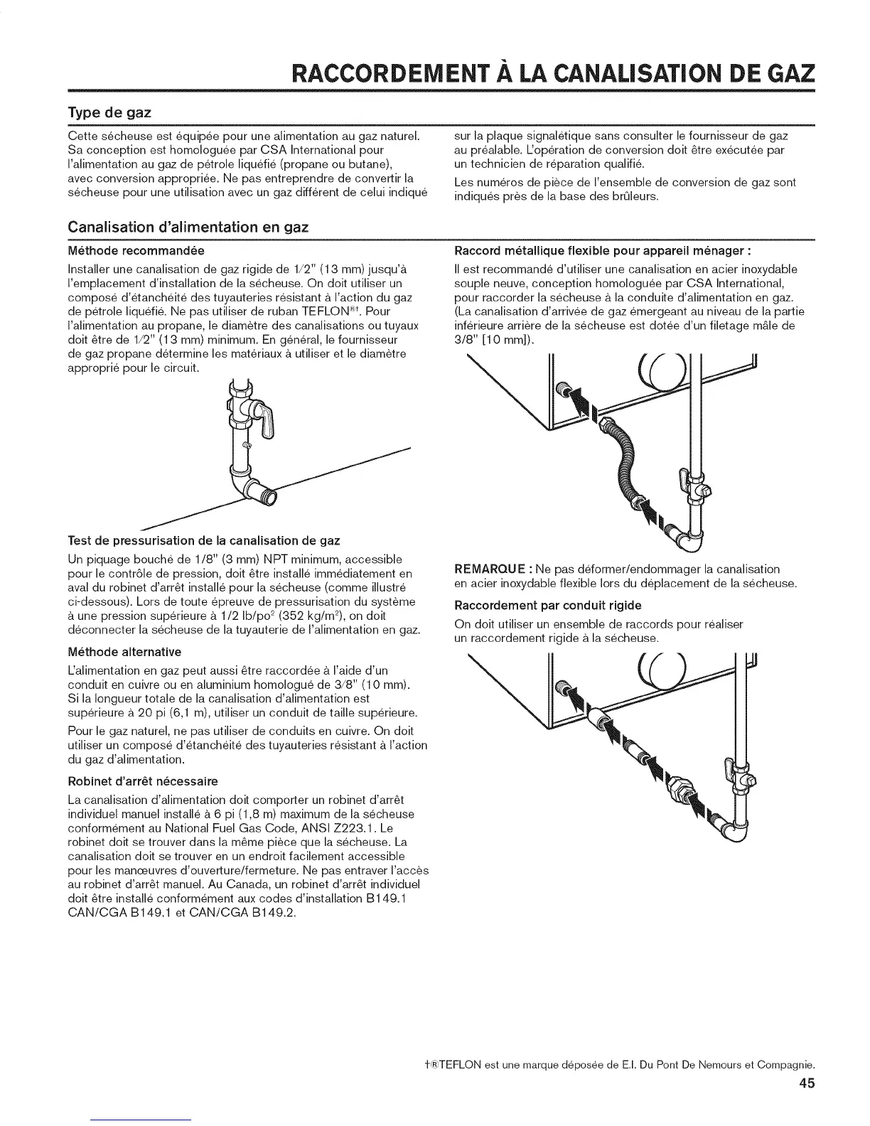 conformement au National Fuel Gas Code, ANSI Z223.1. Le