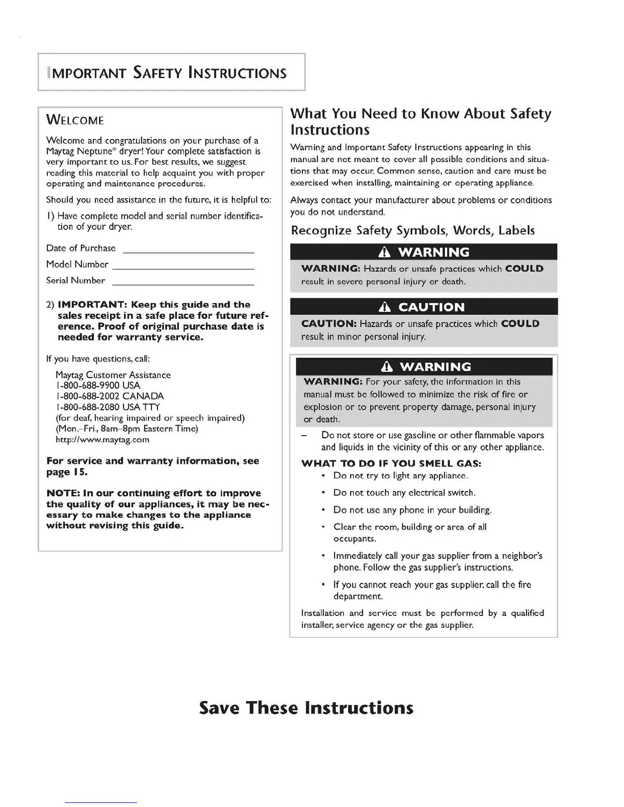 Maytag MDE9700A - Critical Safety Instructions; Safety Information Overview