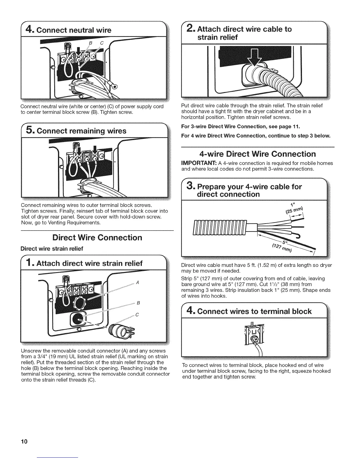 Direct wire cable must have 5 ft. (1.52 m) of extra length so dryer