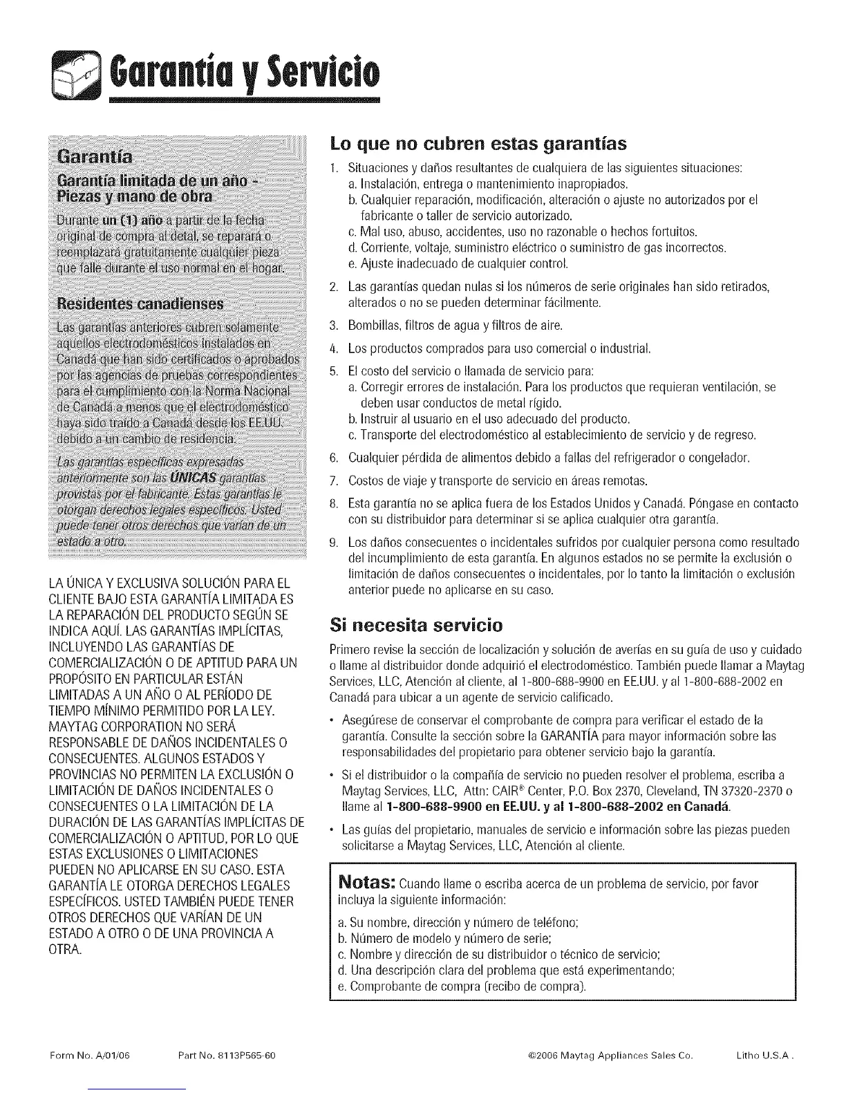 Form No. A/01/06 Part No. 8113P565 60 @2006 Maytag Appliances Sales Co. Lithe U.S.A.