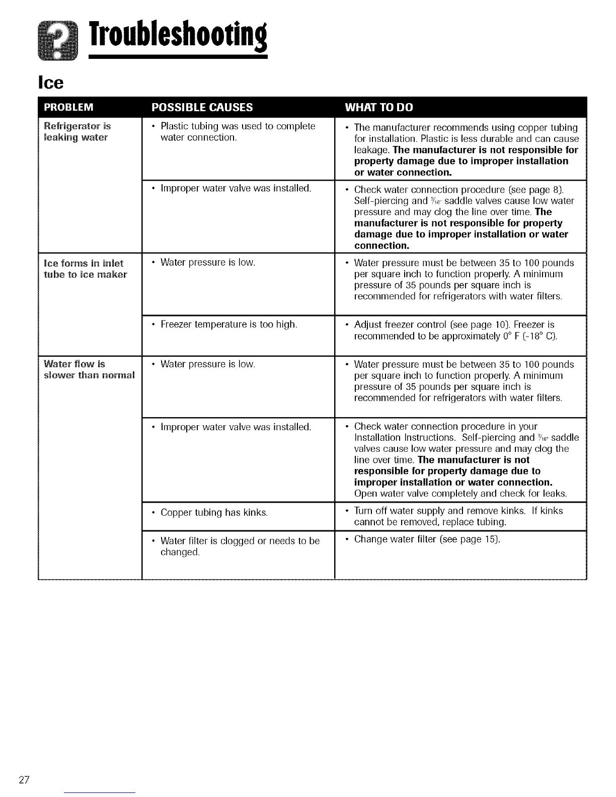 • Copper tubing has kinks. • Turn off water supply and remove kinks. If kinks