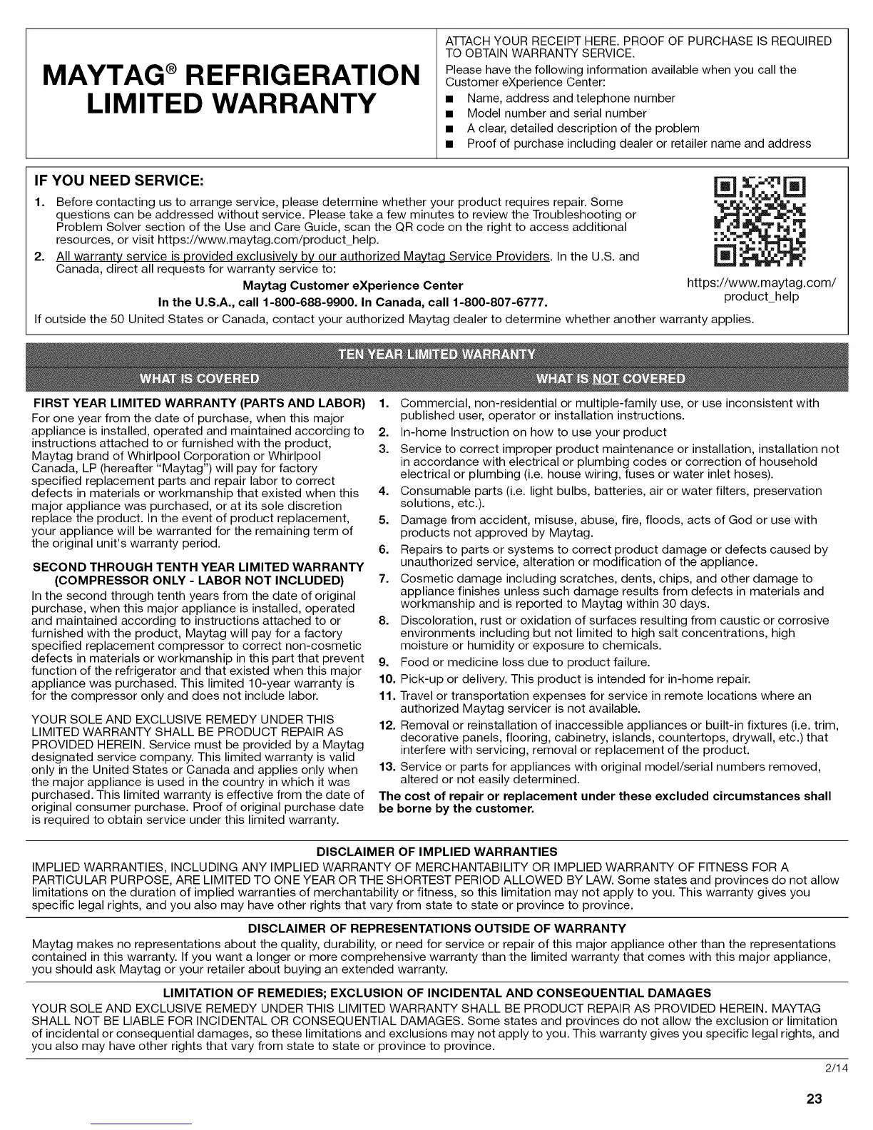2. All warranty service is provided exclusively by our authorized Maytag Service Providers. In the U.S. and