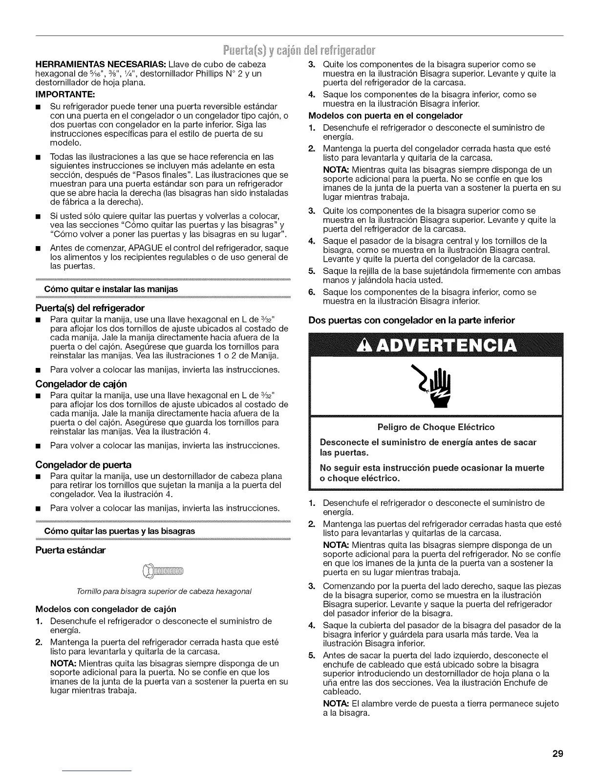 vea las secciones "Como quitar las puertas y las bisagras" y