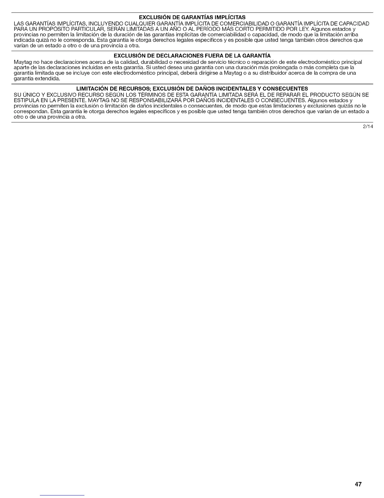 Maytag no hace declaraciones acerca de la calidad, durabilidad o necesidad de servicio tecnico o reparaci6n de este electrodomestico principal