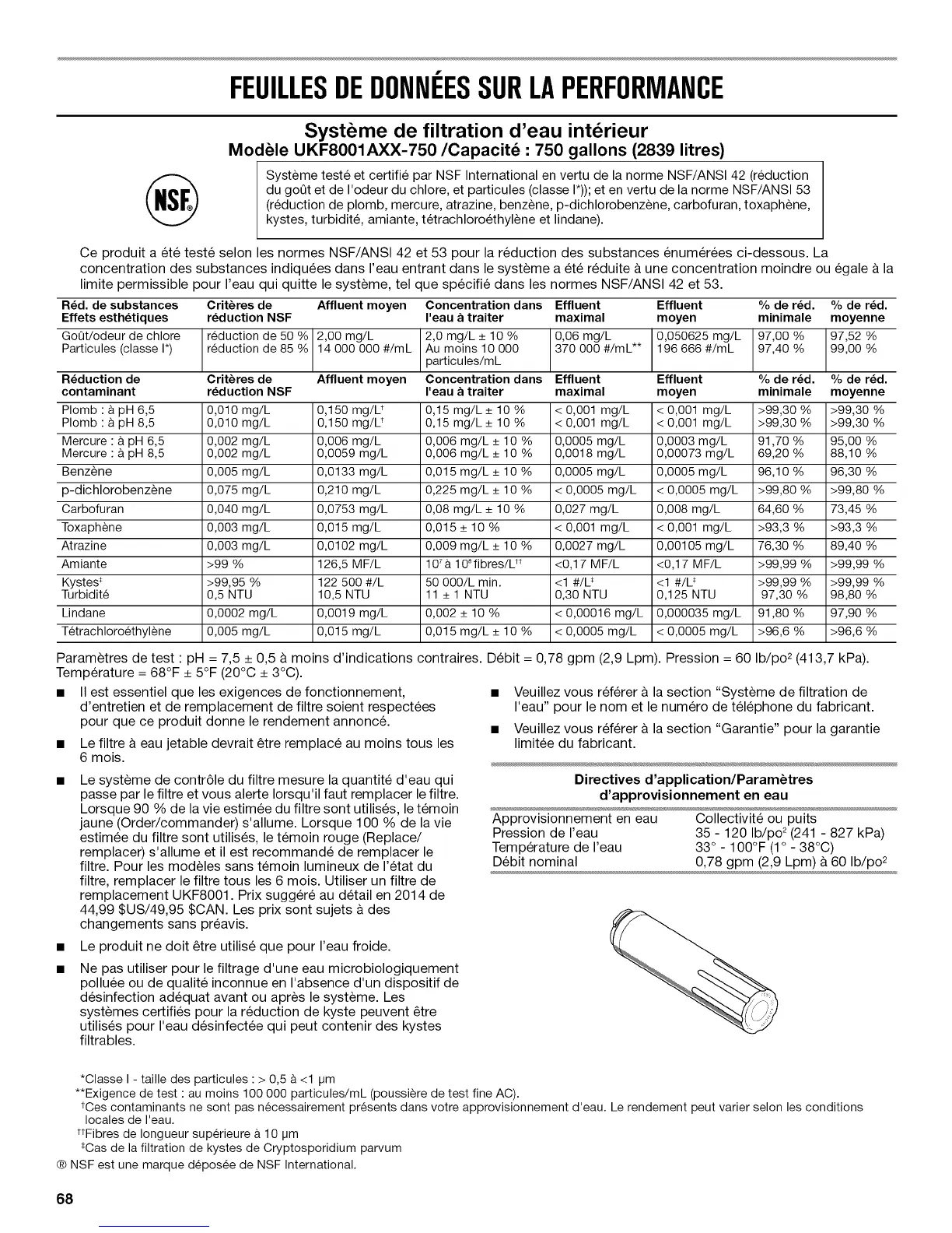 Ce produit a et6 teste selon les normes NSF/ANSI 42 et 53 pour la reduction des substances enum6r6es ci-dessous. La
