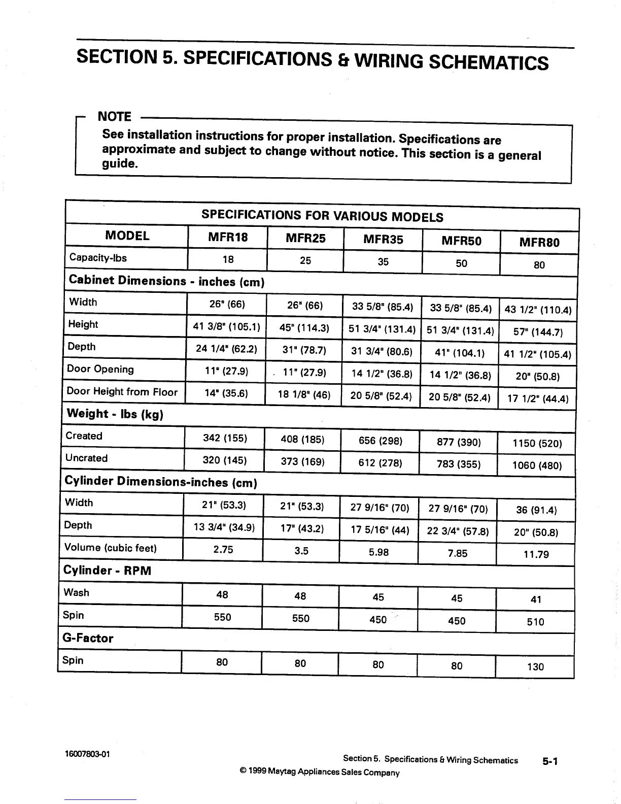 Maytag MFR35 - Section 5. Specifications & Wiring Schematics; Specifications for Various Models