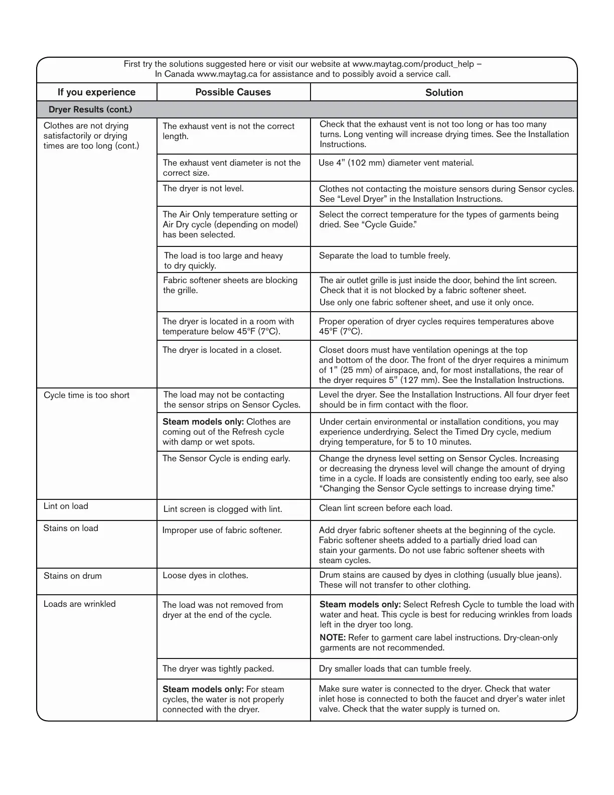 In Canada www.maytag.ca for assistance and to possibly avoid a service call.