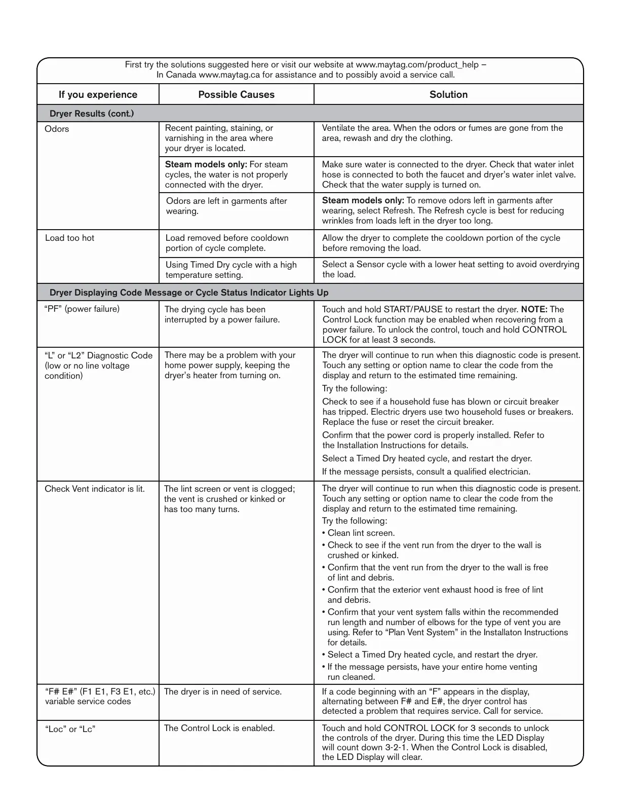 In Canada www.maytag.ca for assistance and to possibly avoid a service call.