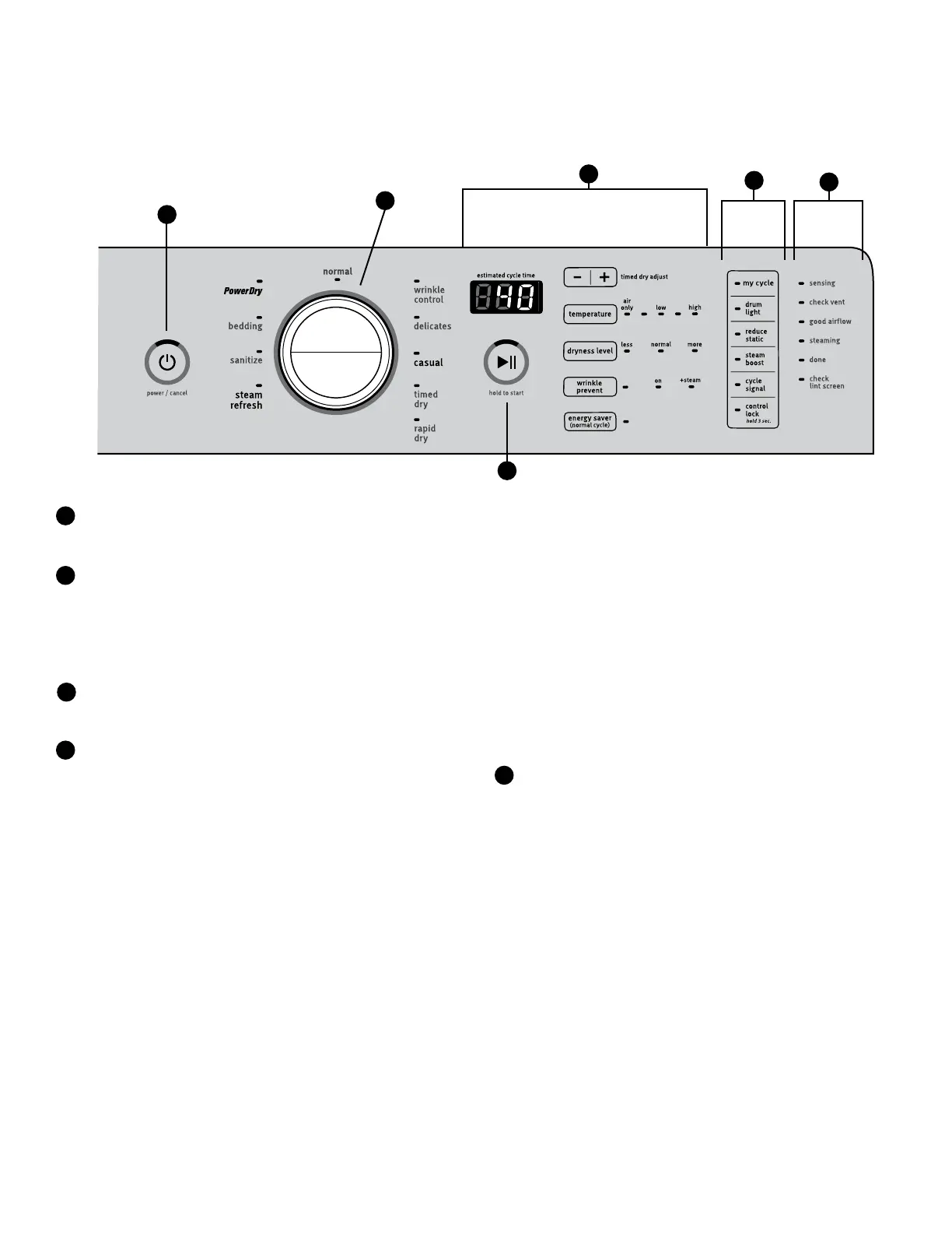 Touch to turn the dryer on and off. Touch to stop/cancel