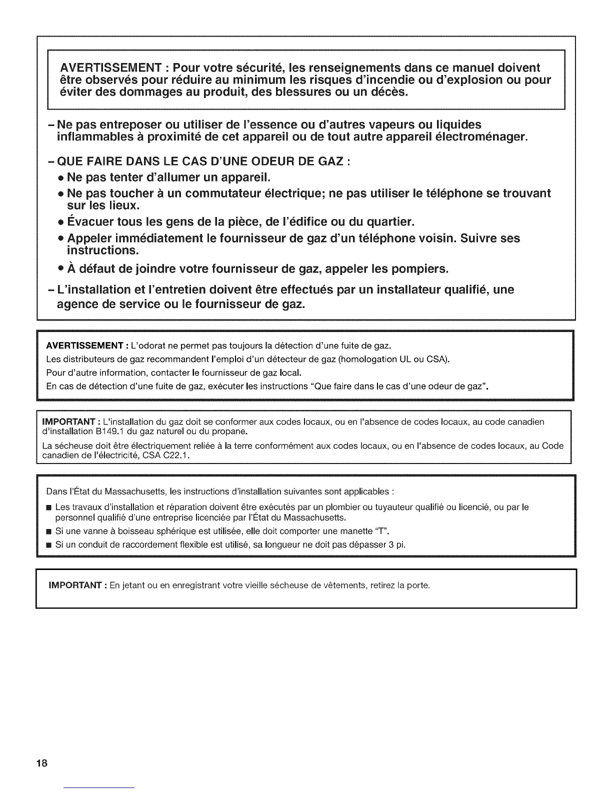 iMPORTANT : L'installation du gaz doit se conformer aux codes Iocaux, ou en I'absence de codes Iocaux, au code canadien