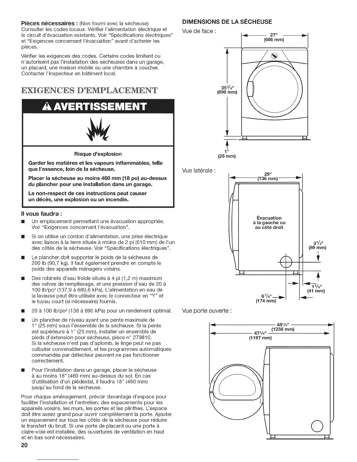Placer la s6cheuse au moins 460 mm (18 po) au=dessus