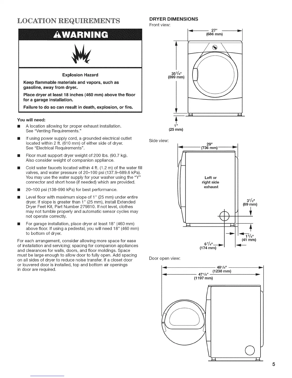 Place dryer at least 18 inches (460 ram) above the floor