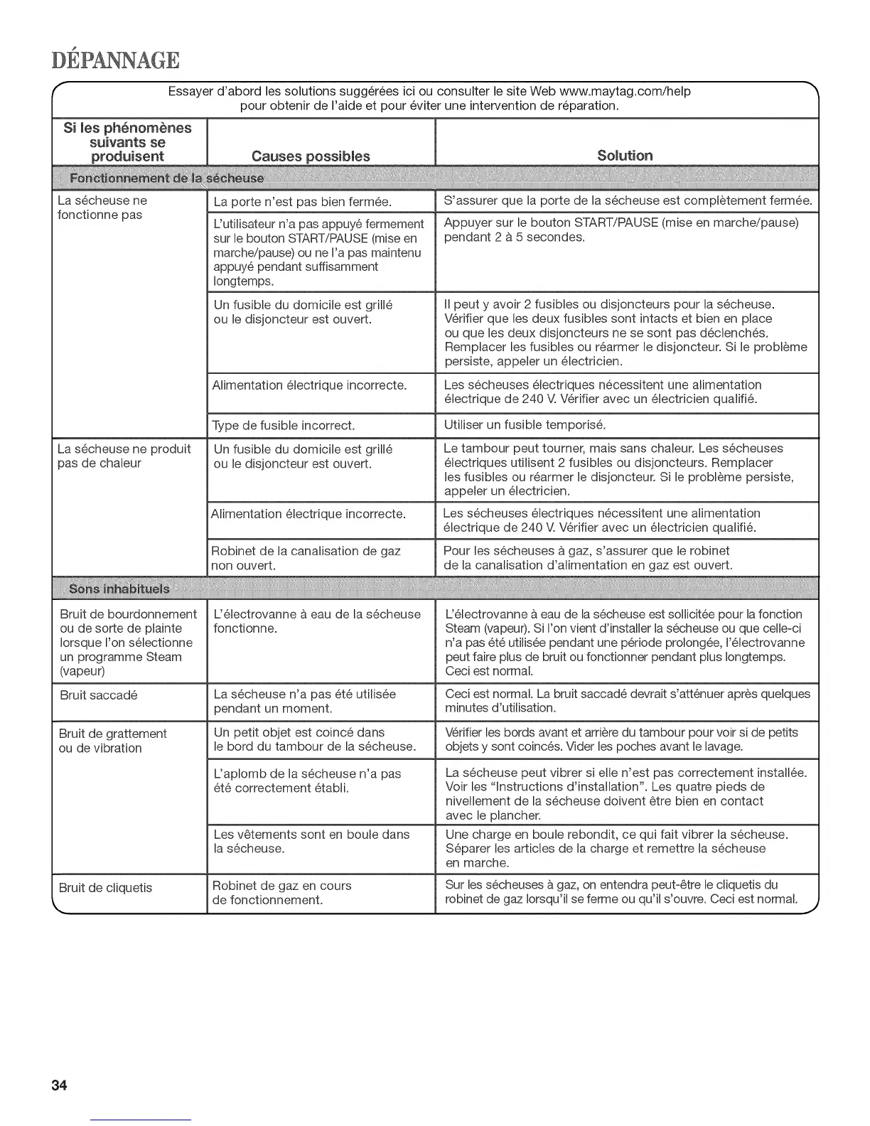 Essayer d'abord les solutions sugg6r6es ici ou consulter le site Web www.maytag.com/help