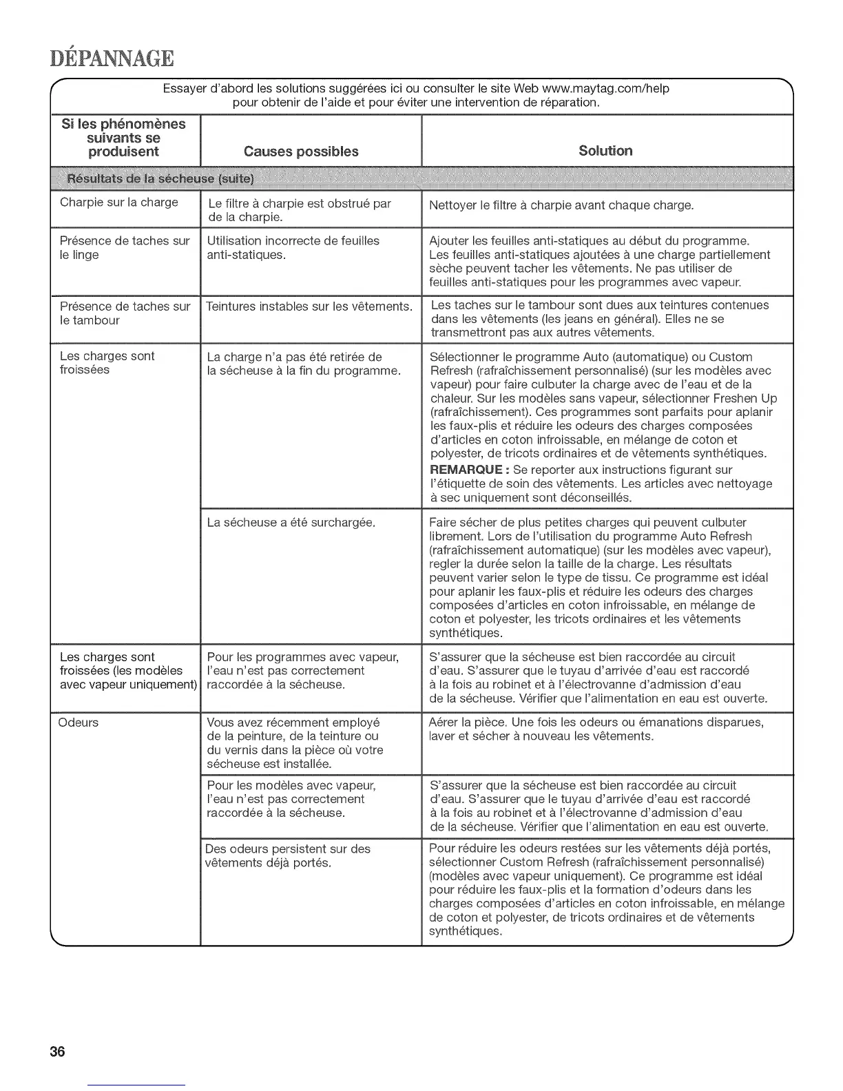 Essayer d'abord les solutions sugg6r6es ici ou consulter le site Web www.maytag.com/help