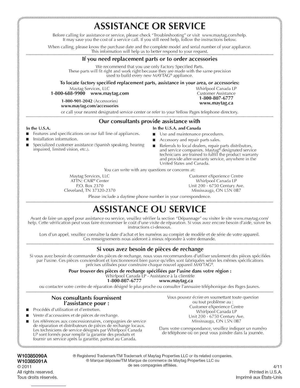 Avant de faire un appe[ pour assistance ou service, veuillez v6rifier [a section "D6pannage" ou visiter [e site www.maytag.com/