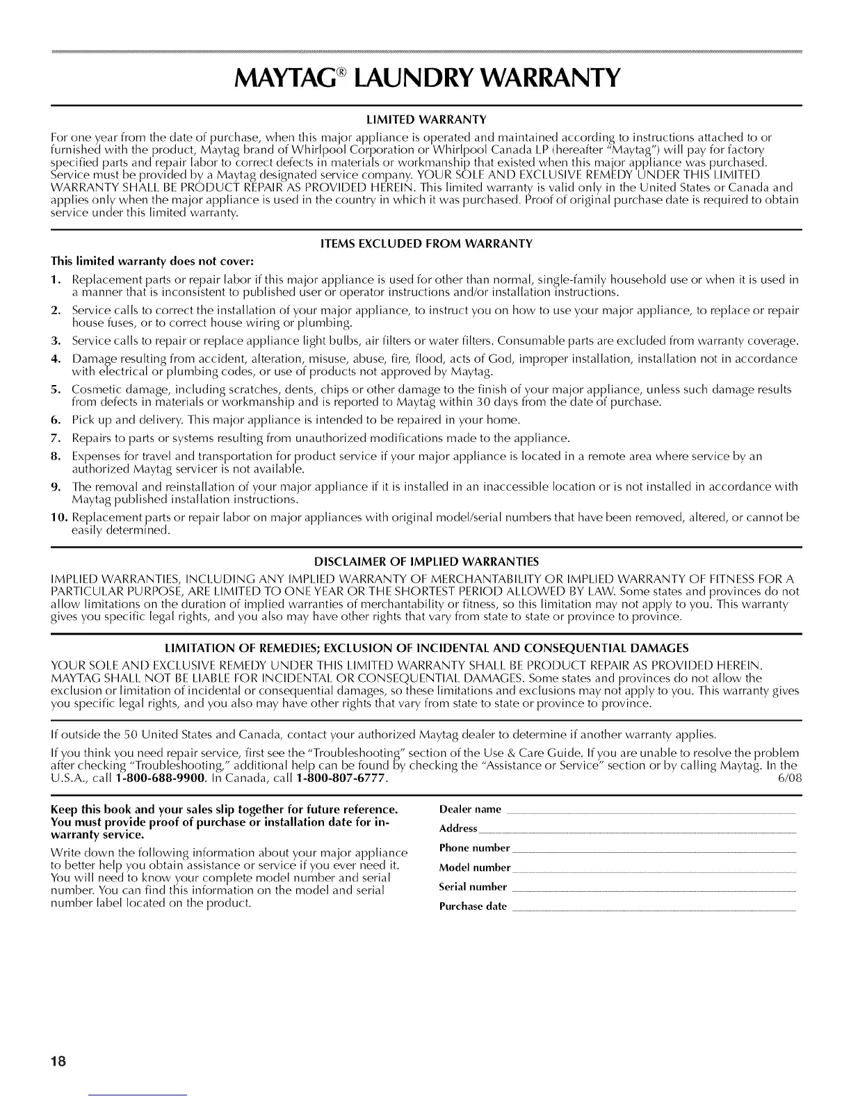 MAYTAG SHAI.I_ NOT BE I.IABI_E FOR INCIDENTAl_ OR CONSEQUENTIAl_ DAMAGES. Some states and provinces do not allow the