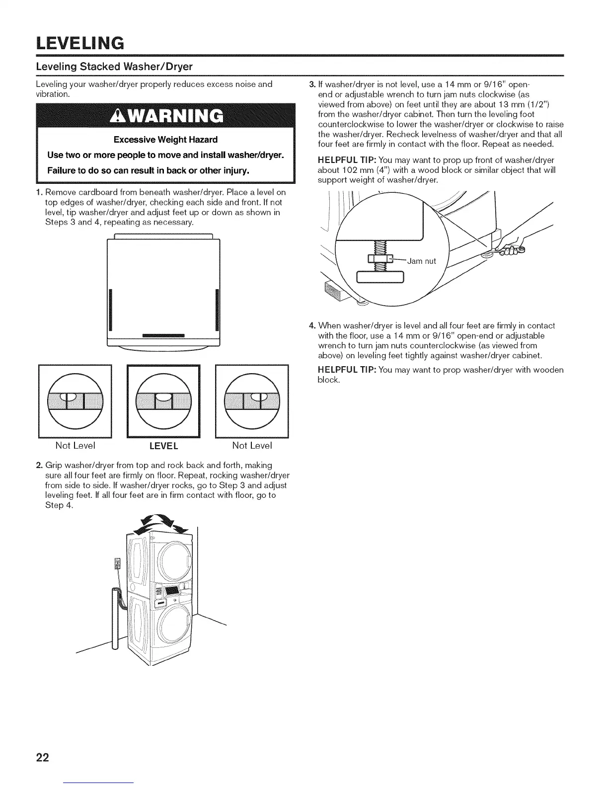 3. If washer/dryer is not level, use a 14 mm or 9/16" open-