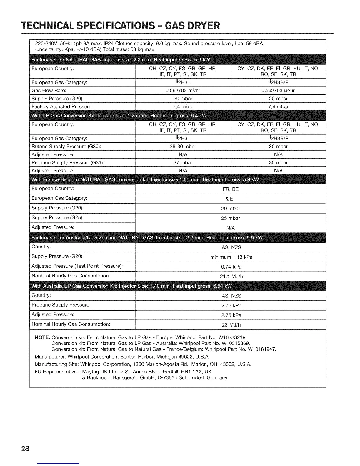 NOTE: Conversion kit: From Natural Gas to LP Gas - Europe: Whirlpool Part No. W10233219.