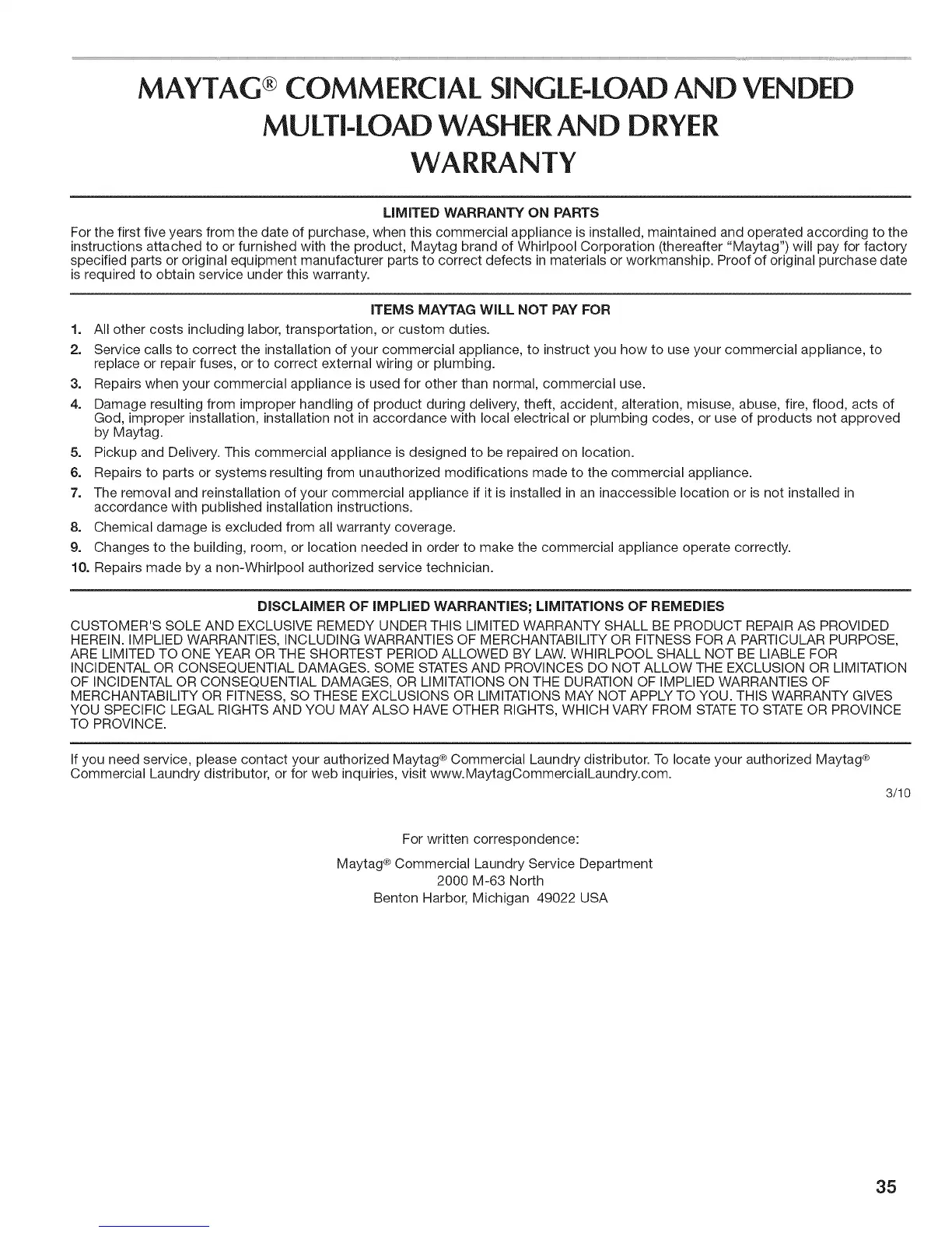 ITEMS MAYTAG WILL NOT PAY FOR