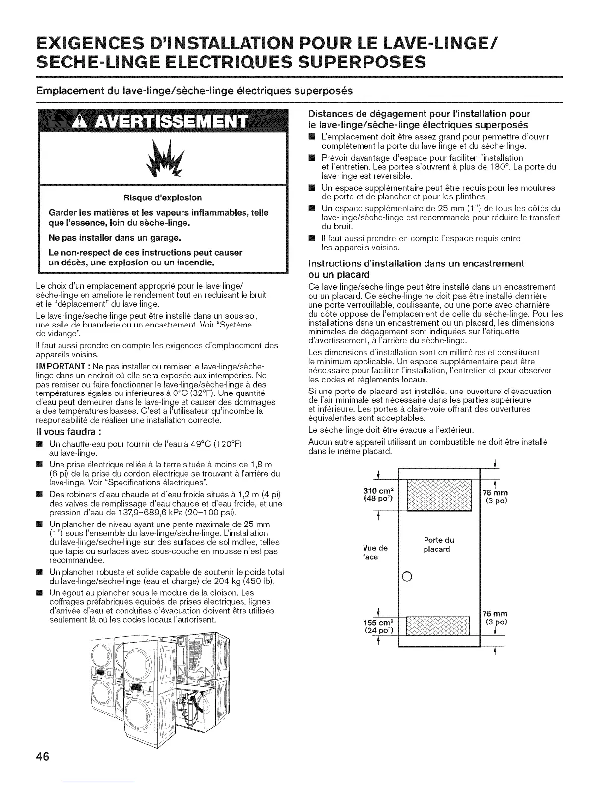 Emplacement du lave-linge/seche-linge electriques superposes