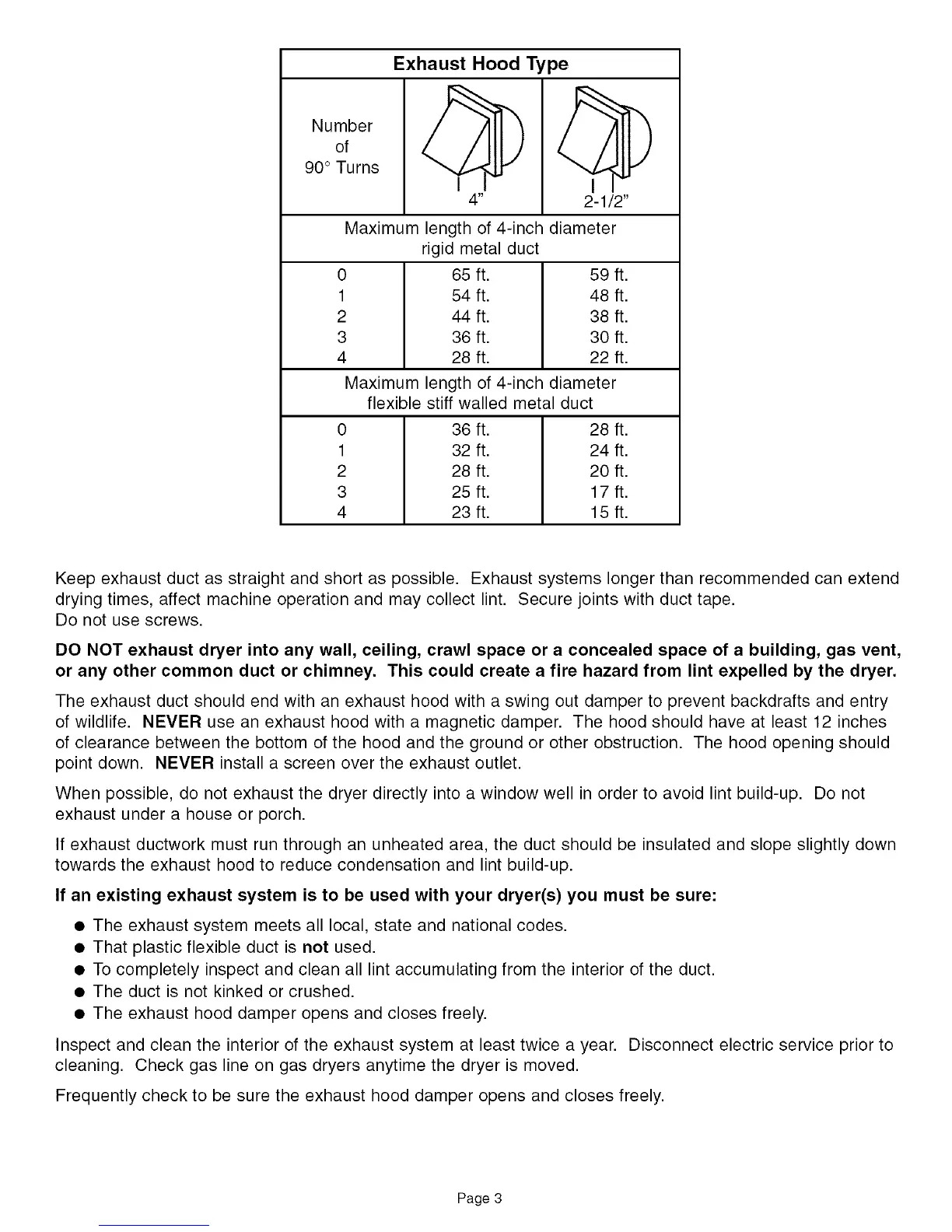 Keep exhaust duct as straight and short as possible. Exhaust systems longer than recommended can extend