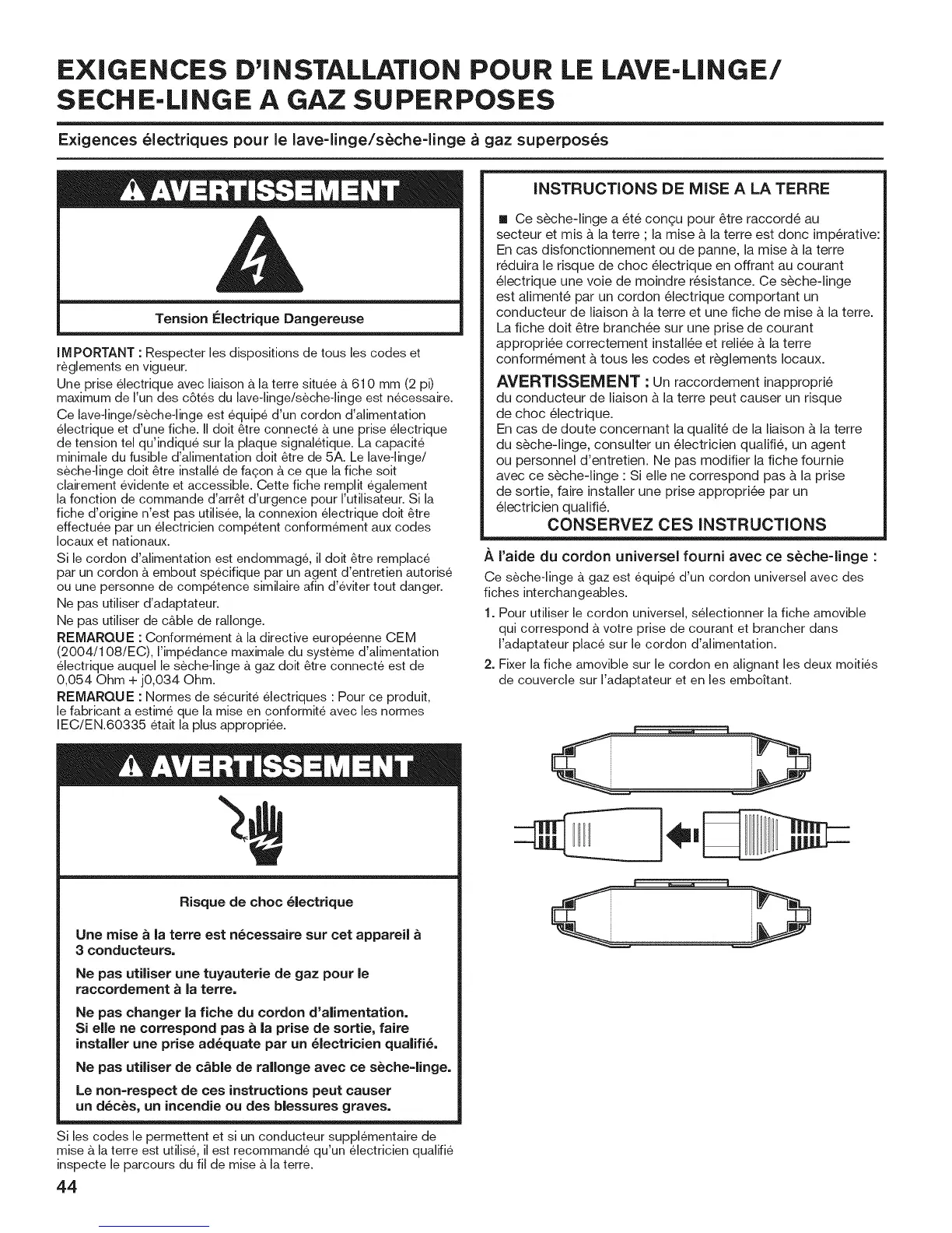 Exigences electriques pour le lave-linge/seche-linge a gaz superposes