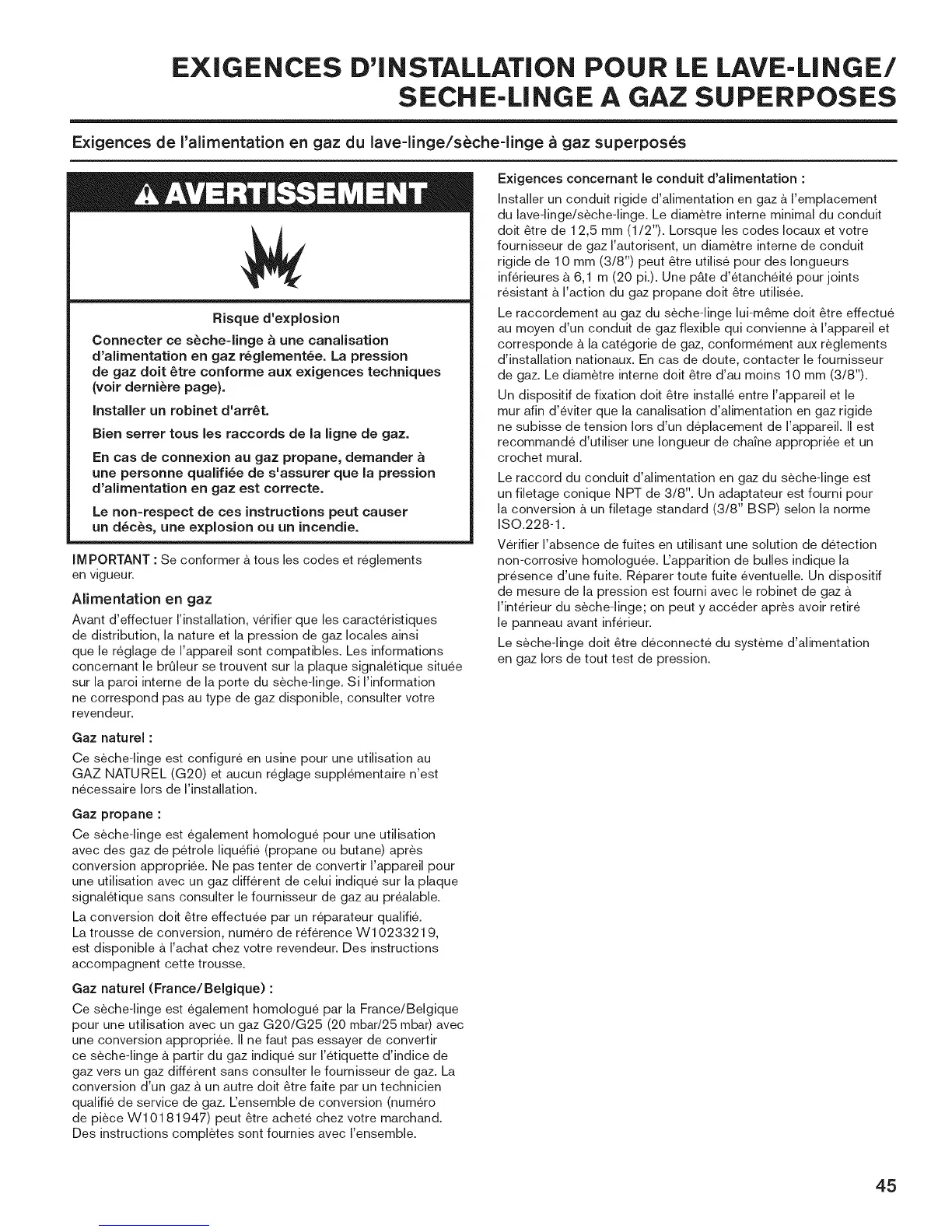E×igences de ralimentation en gaz du lave-linge/seche-linge a gaz superposes