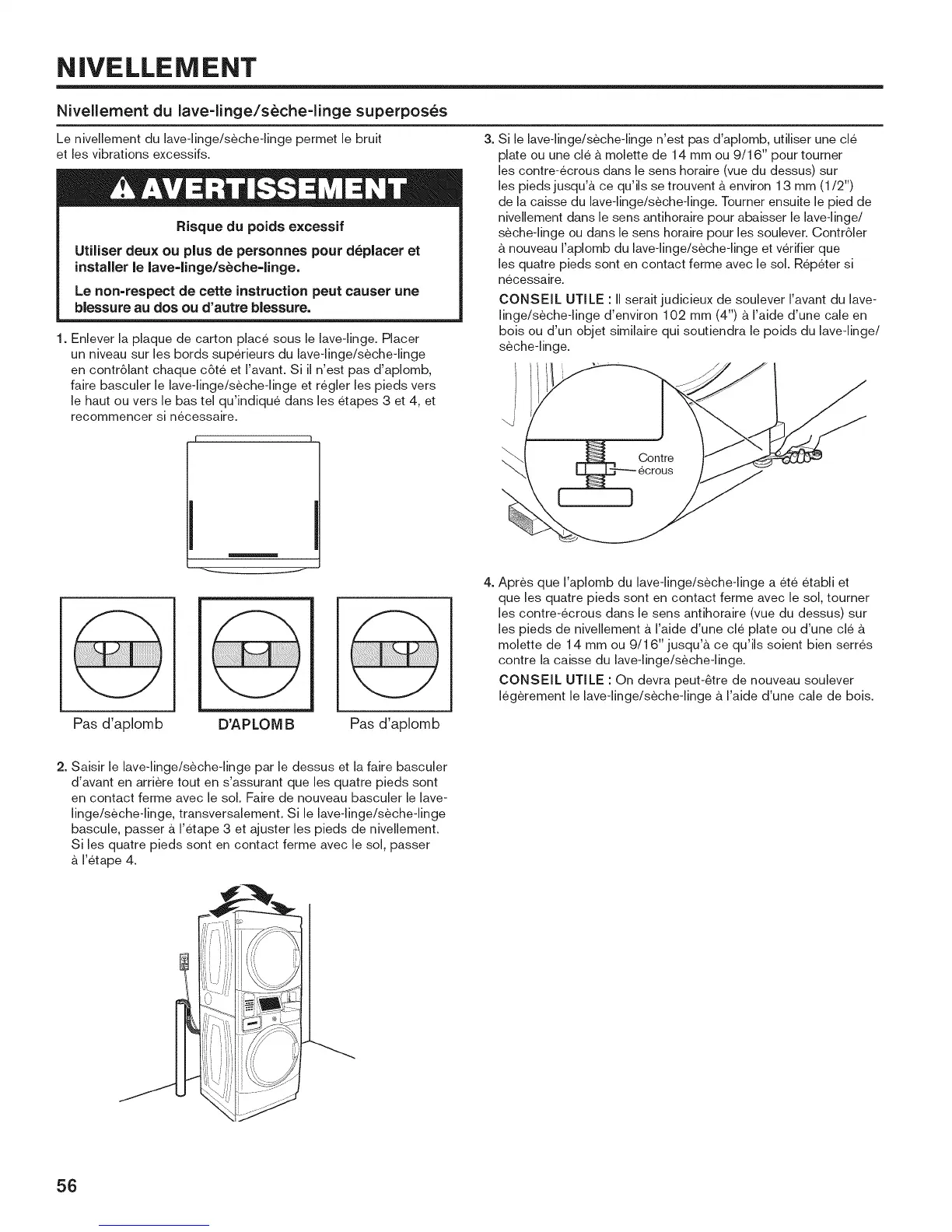 4. Apres que Faplomb du lave-linge/seche-linge a ete etabli et