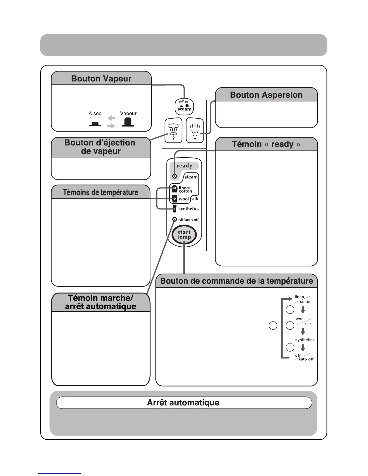 • Si on laisse le fer sur le support qui demeure alimenté, il cesse automatiquement de fonctionner après
