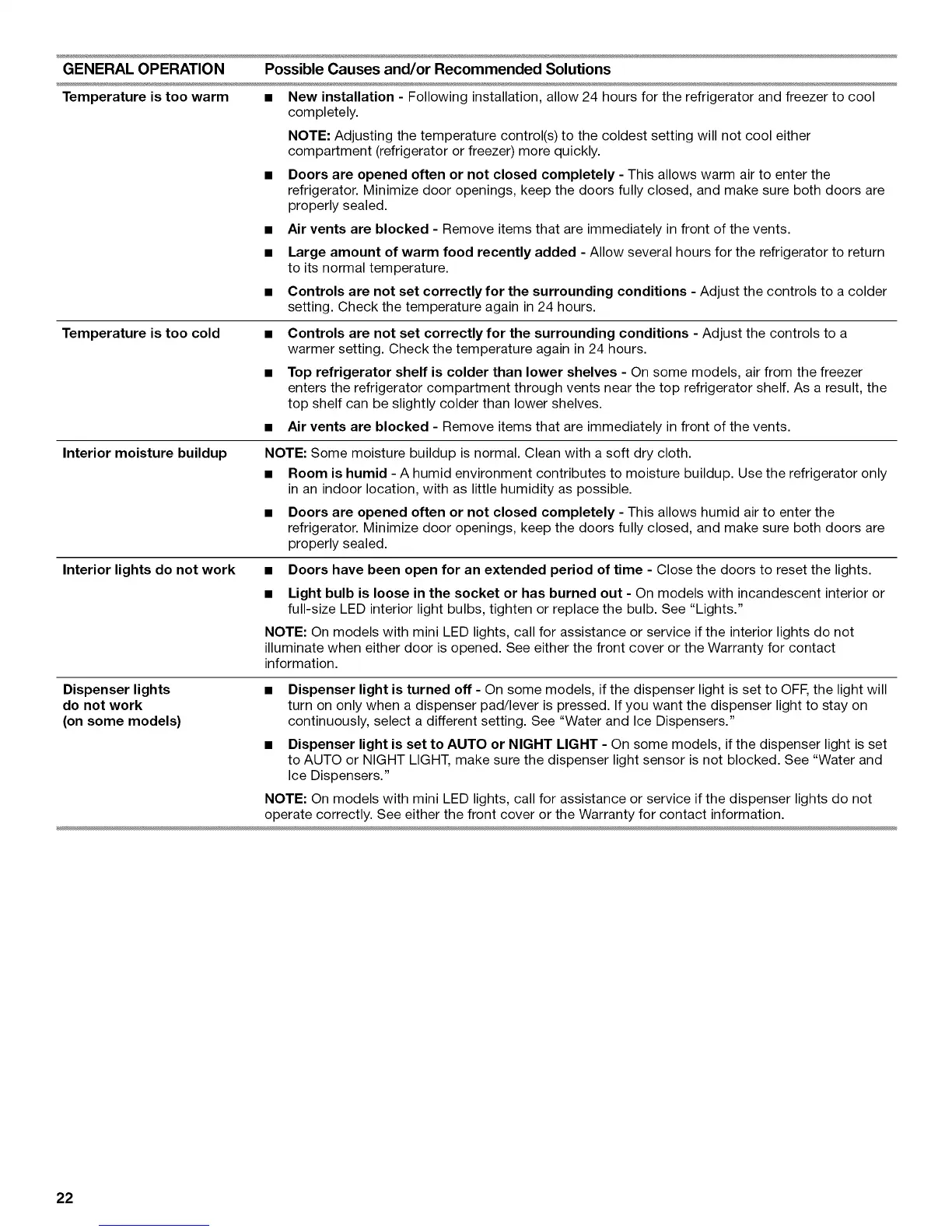 GENERAL OPERATION Possible Causes and/or Recommended Solutions