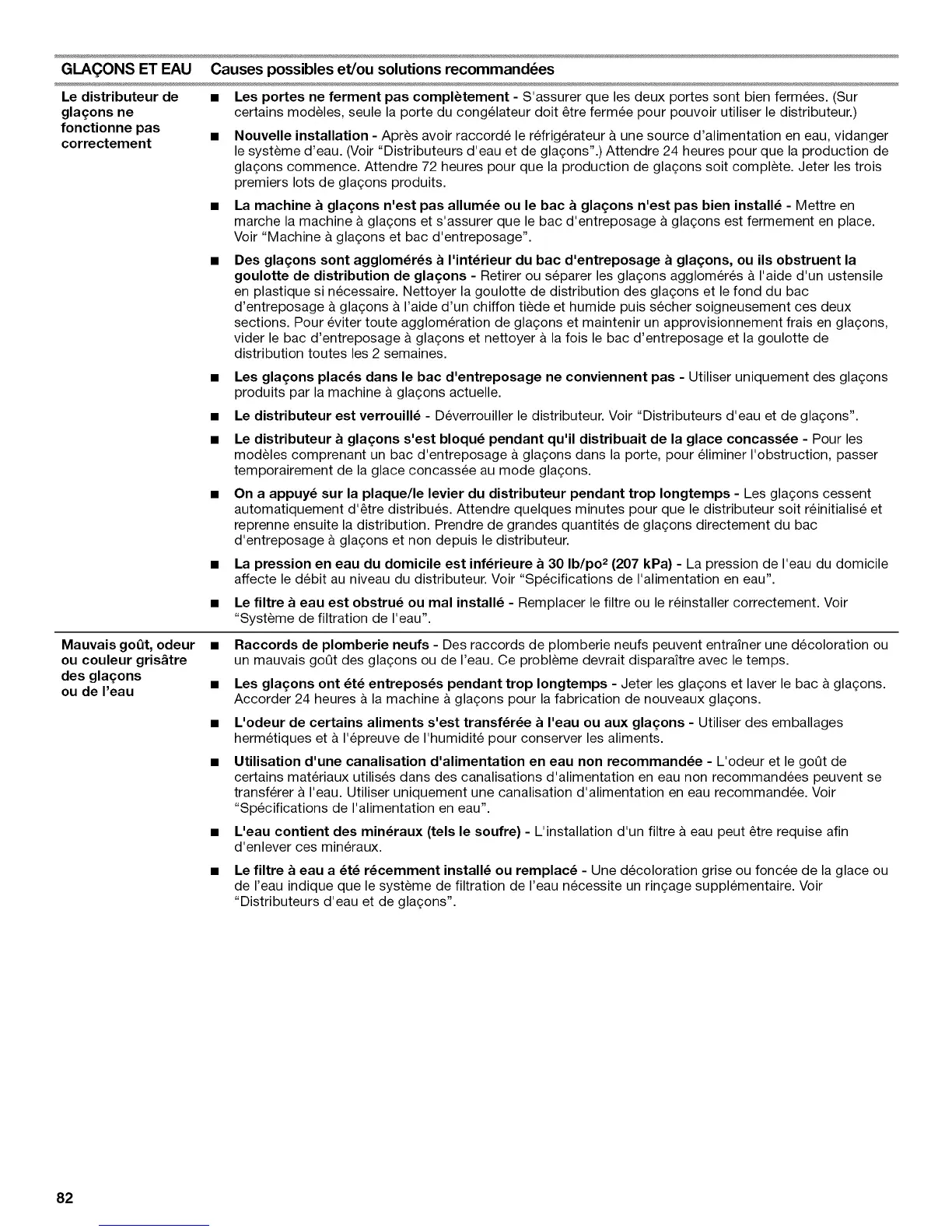 le systeme d'eau. (Voir "Distributeurs d'eau et de glagons".) Attendre 24 heures pour que la production de