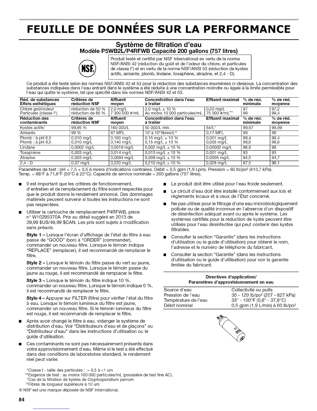 Parametres de test : pH = 7,5 _+0,5 & moins d'indications contraires. Debit = 0,5 gpm (1,9 Lpm). Pression = 60 Ib/po 2 (413,7 kPa).