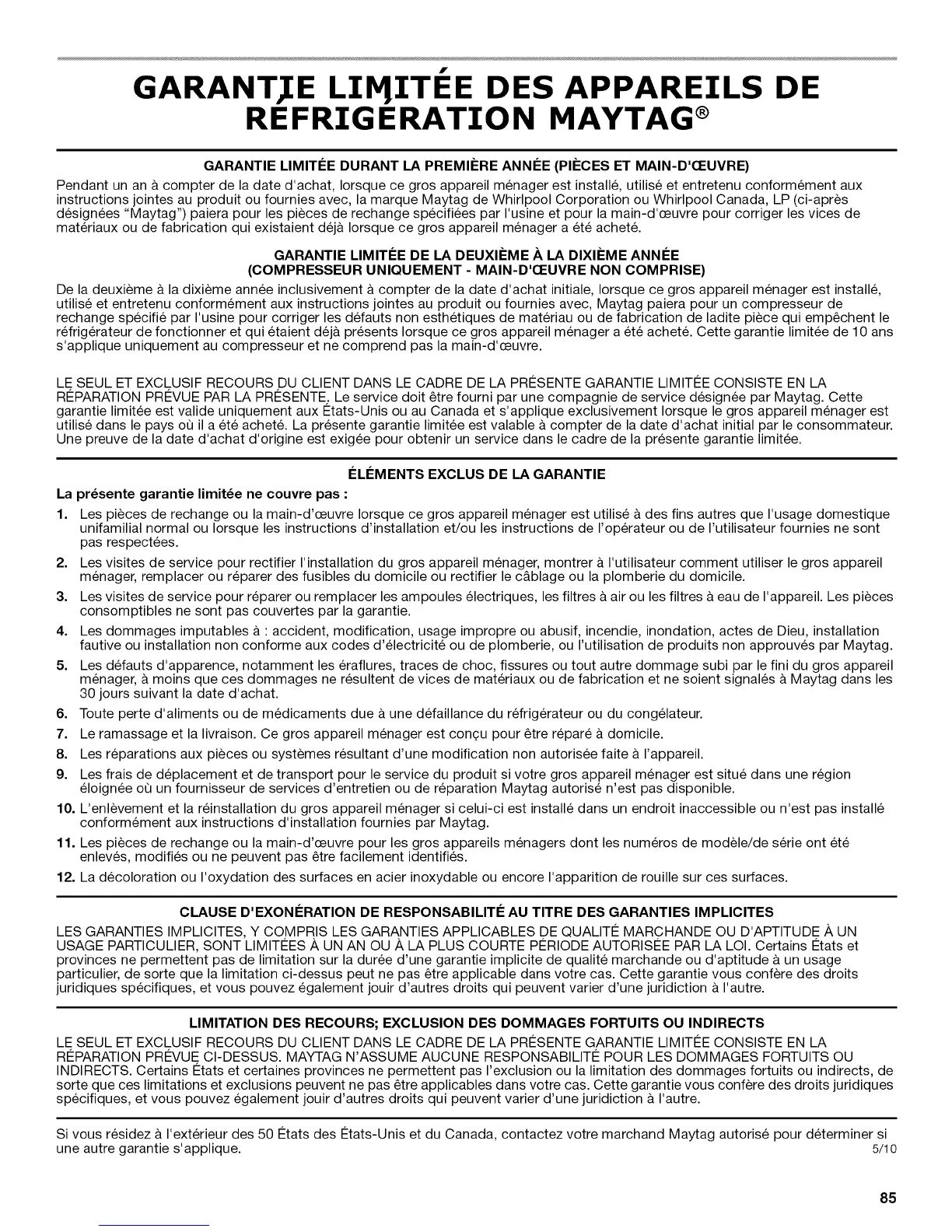 utilise et entretenu conformement aux instructions jointes au produit ou fournies avec, Maytag paiera pour un compresseur de