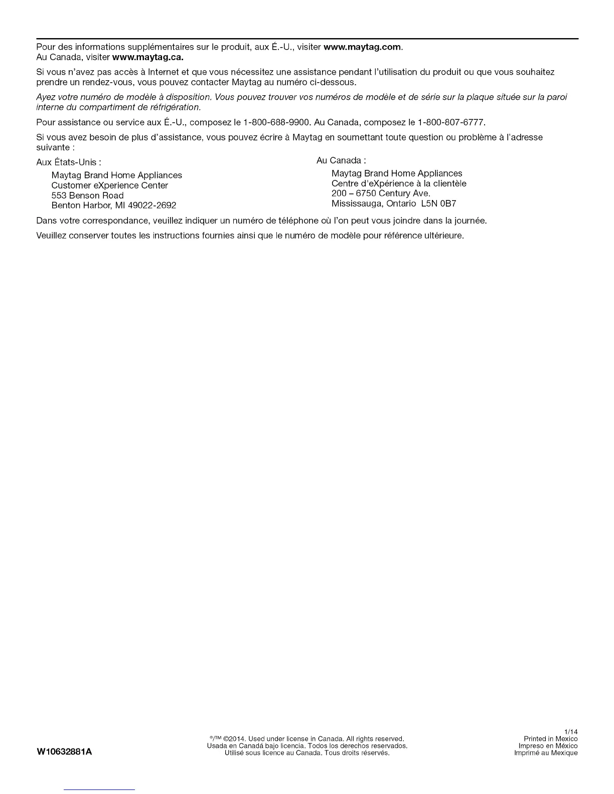 Pour des informations supplementaires sur le produit, aux €:.-U., visiter www.maytag.com.