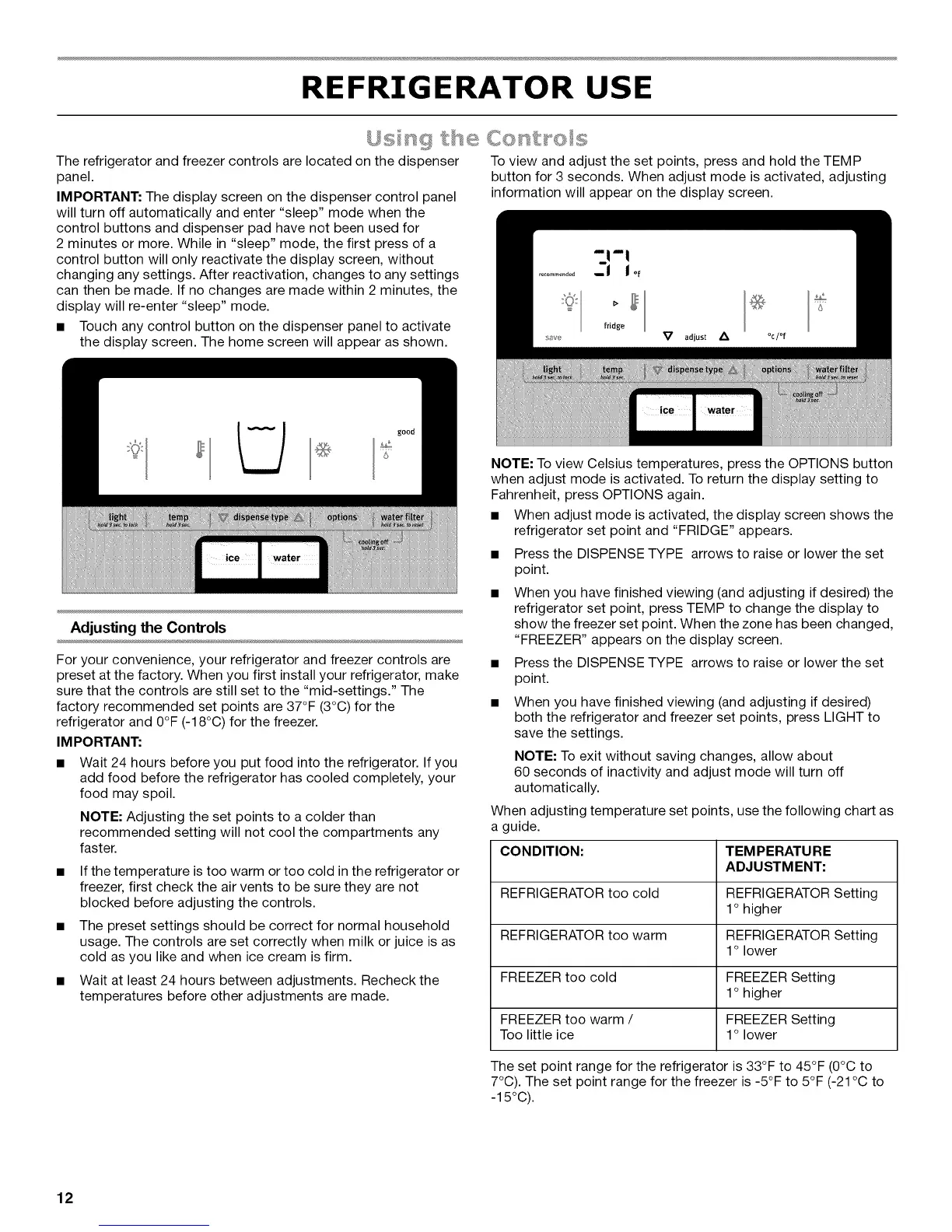 7°C). The set point range for the freezer is -5°F to 5°F (-21 °C to