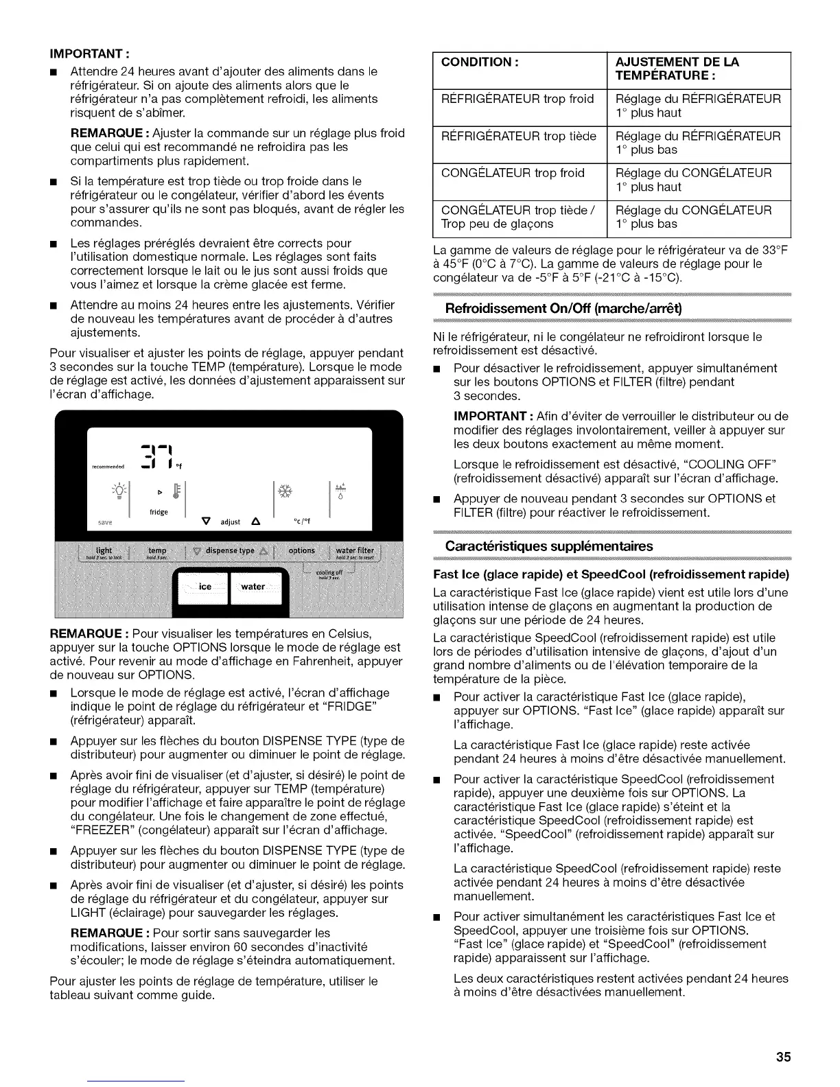 & 45°F (0°C & 7°C). La gamme de valeurs de reglage pour le