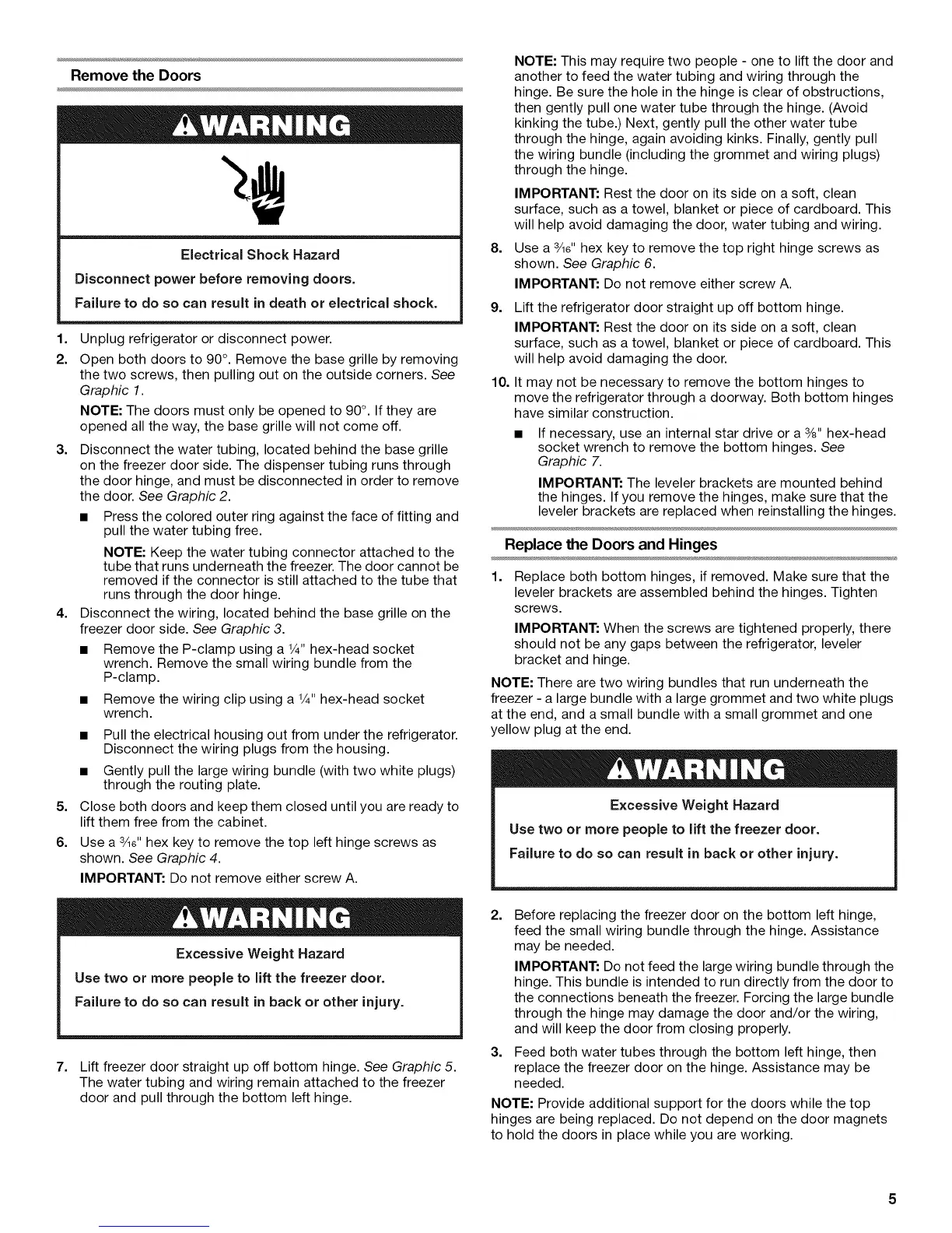 7. Lift freezer door straight up off bottom hinge. See Graphic 5.