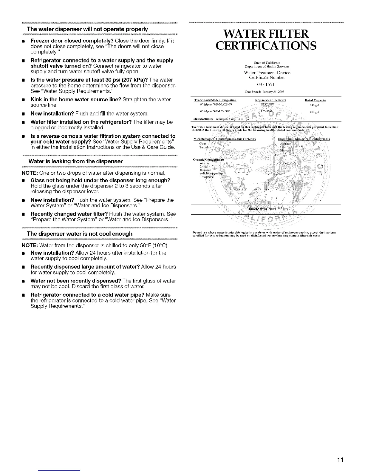 NOTE: Water from the dispenser is chilled to only 50°F (10°C).