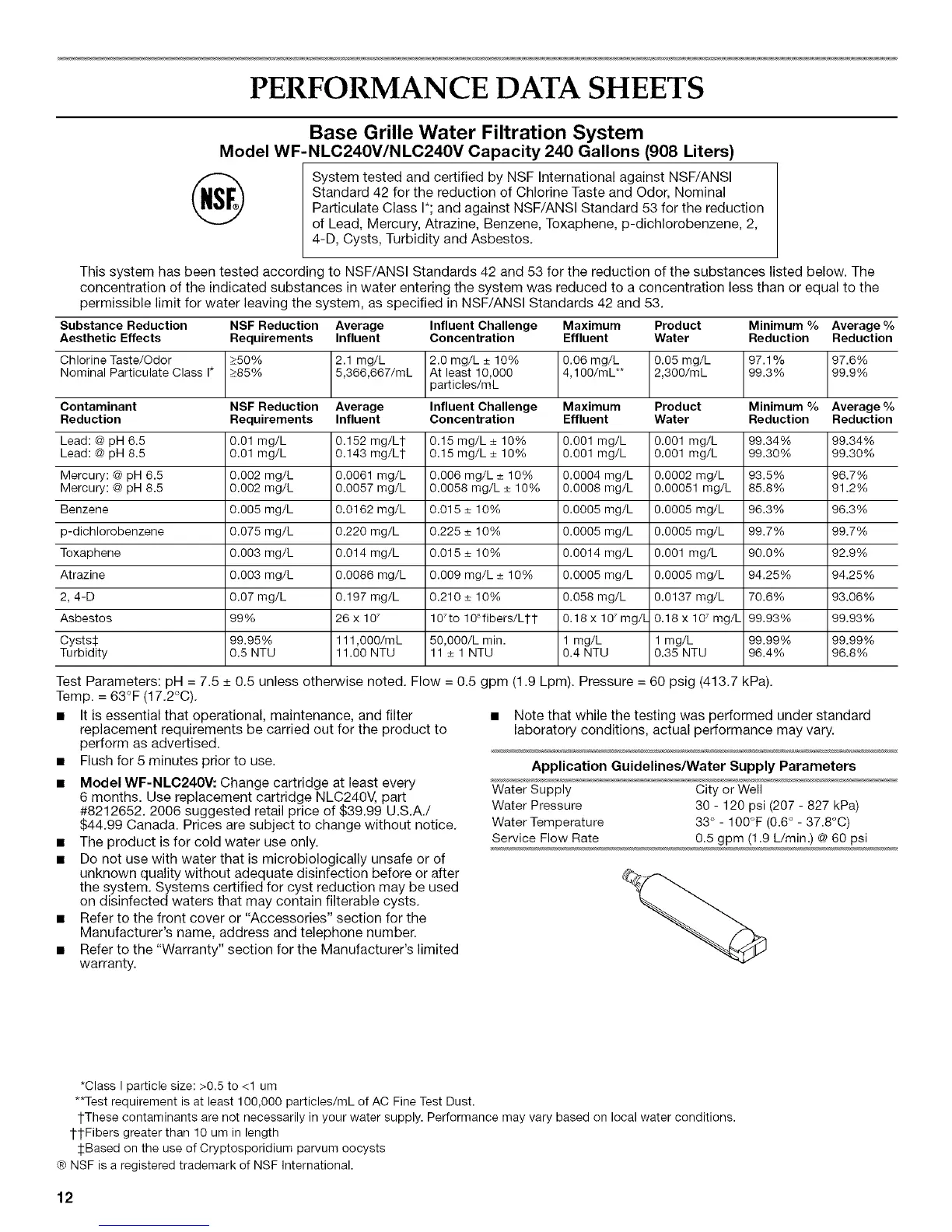 Contaminant NSF Reduction Average Influent Challenge Maximum Product Minimum % Average %
