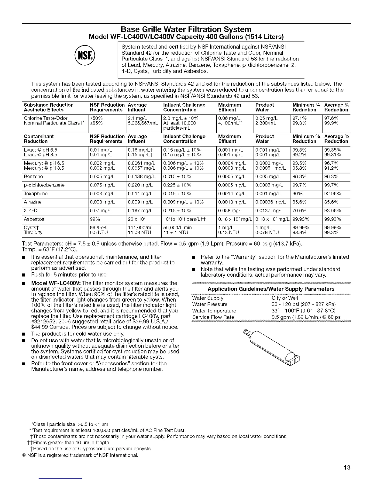 This system has been tested according to NSF/ANSI Standards 42 and 53 for the reduction of the substances listed below. The