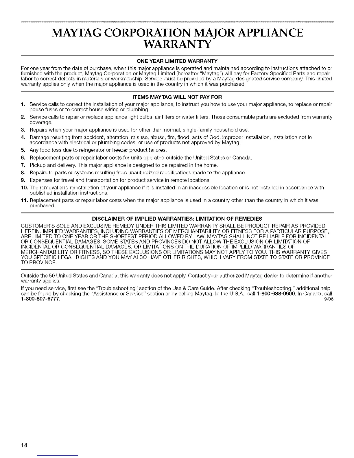 can be found by checking the "Assistance or Service" section or by calling Maytag. In the U.S.A., call 1-800-688-9900. In Canada, call