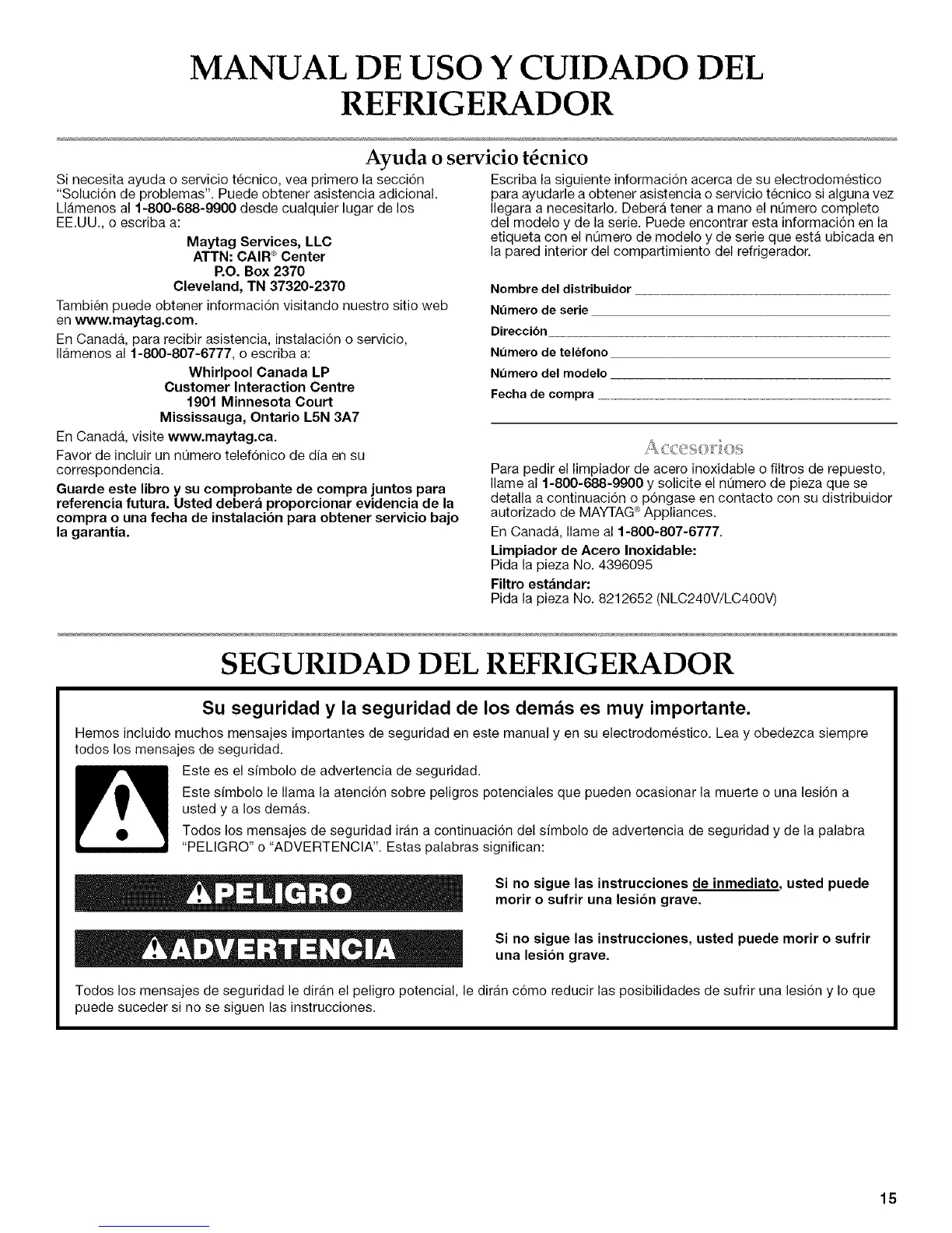 Ilame al 1-800-888-9900 y solicite el nt]mero de pieza que se