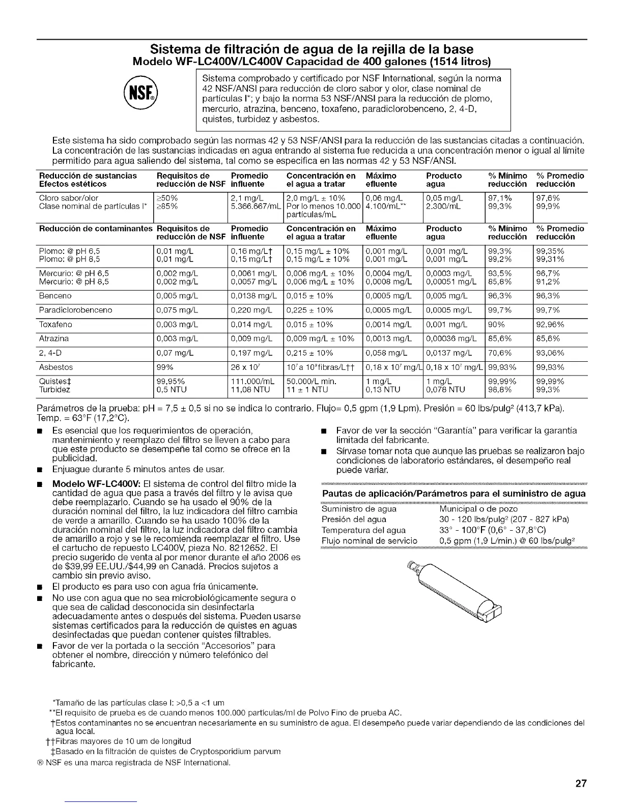 Este sistema ha sido comprobado segOn las normas 42 y 53 NSF/ANSI para la reducci6n de las sustancias citadas a continuaci6n.
