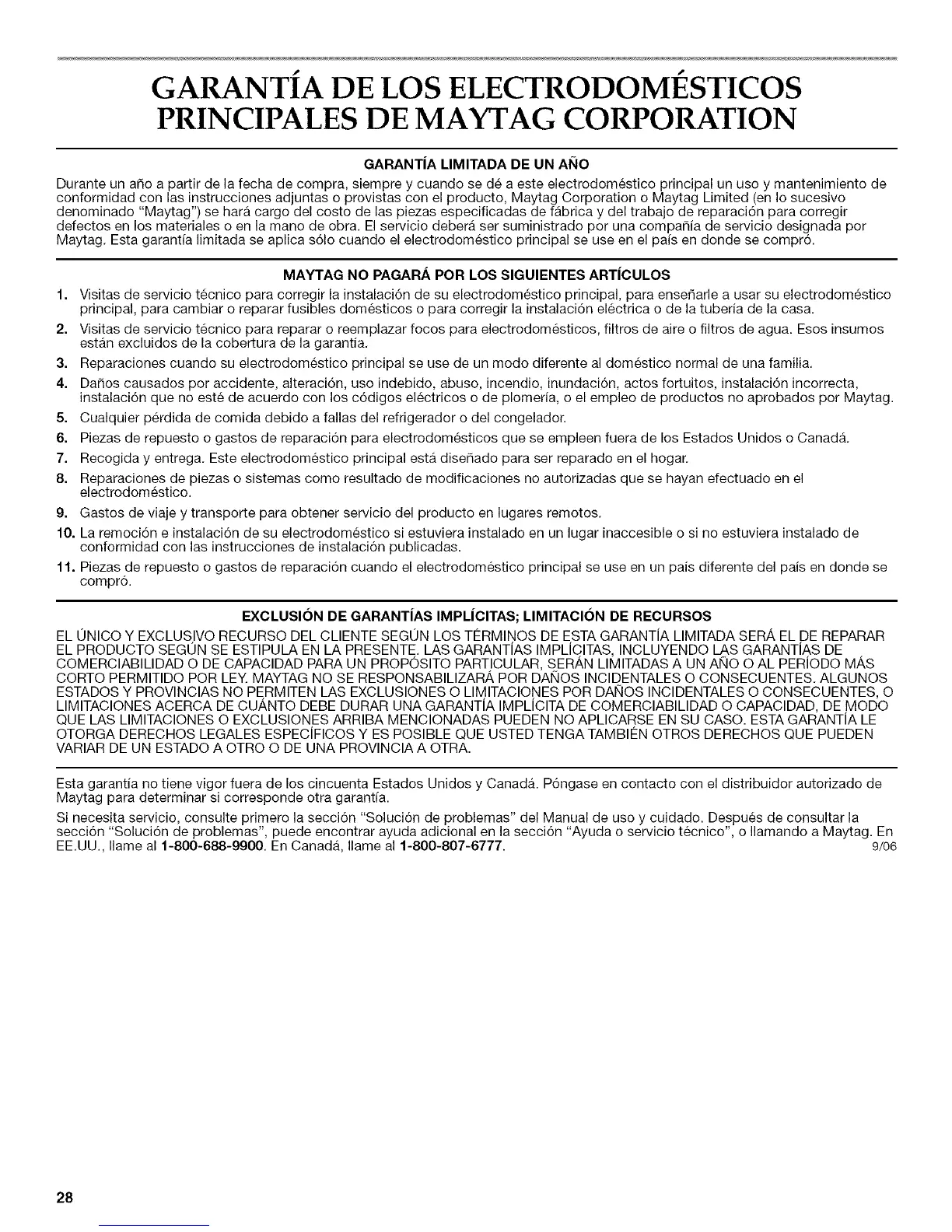 Maytag. Esta garantia limitada se aplica s61o cuando el electrodomestico principal se use en el pais en donde se compr6.